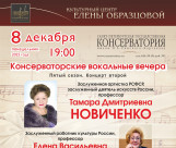 Второй концерт сезона цикла «Консерваторские вокальные вечера» представит студентов классов сольного пения заслуженного деятеля искусств России, заслуженной артистки РСФСР, профессора Тамары Дмитриевны Новиченко, заслуженного работника культуры России, профессора Елены Васильевны Опариной и преподавателя Марии Анатольевны Бочмановой.