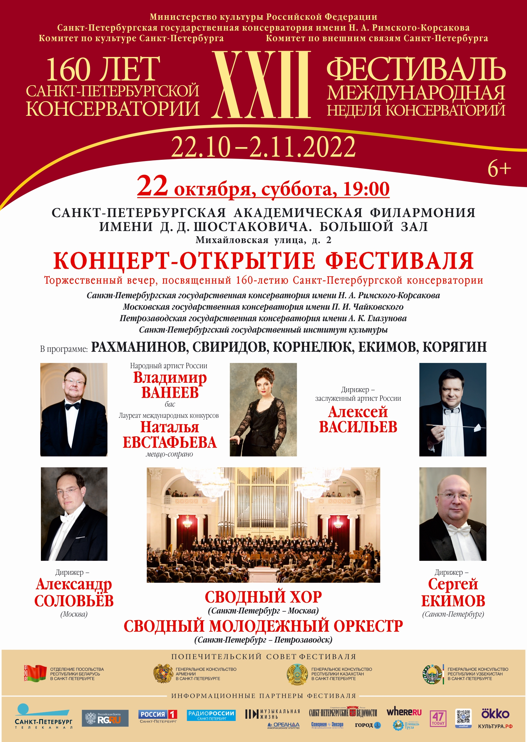 22 октября в Большом зале Санкт-Петербургской филармонии пройдёт официальное открытие Фестиваля с церемонией награждения профессорско-преподавательского-состава Консерватории. В церемонии примут участие представители Министерства культуры РФ и Правительства Санкт-Петербурга. В программе вечера – Патетическая оратория прославленного выпускника Санкт-Петербургской консерватории Георгия Свиридова в исполнении Сводного хора и Молодежного международного симфонического оркестра, в котором объединятся молодые музыканты ведущих российских консерваторий и Национального университета искусств Казахстана с Санкт-Петербургской консерваторией во главе. За дирижерским пультом – ректор Санкт-Петербургской консерватории, заслуженный артист РФ Алексей Васильев