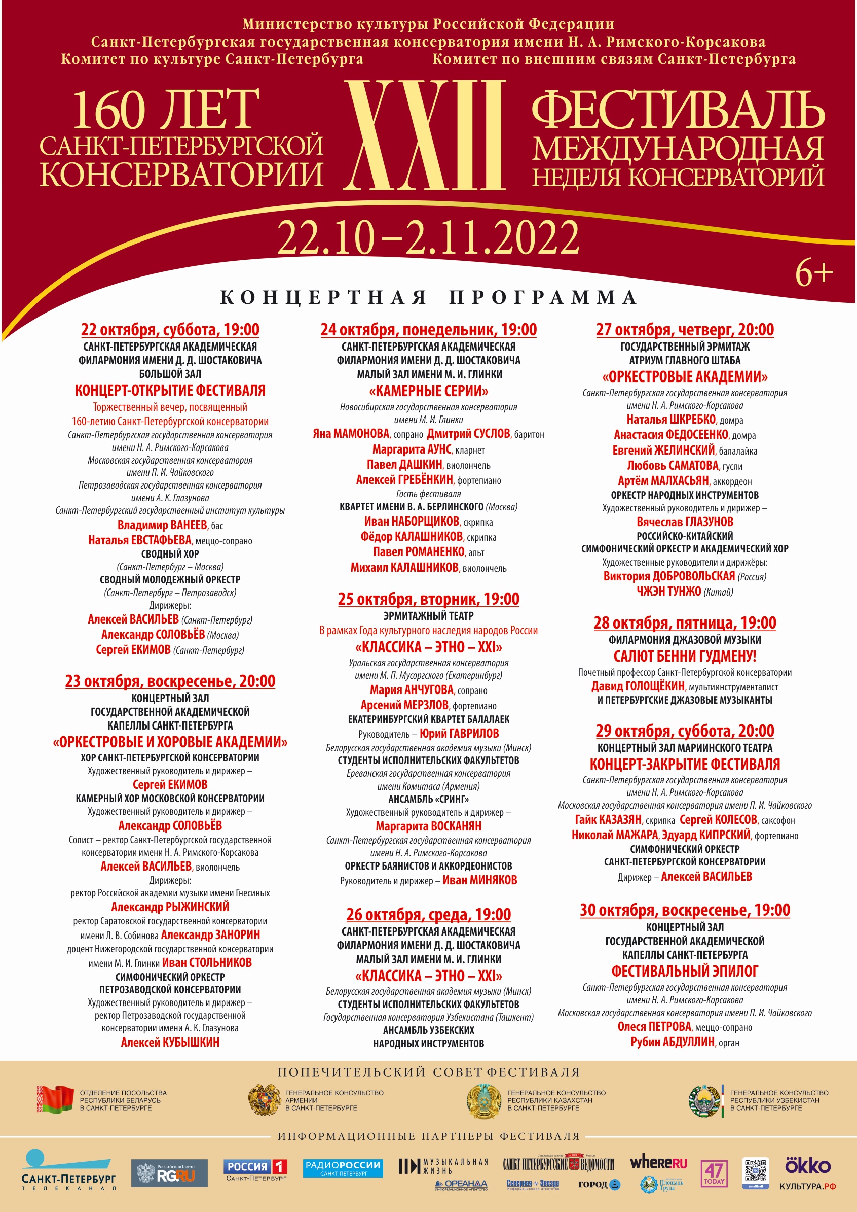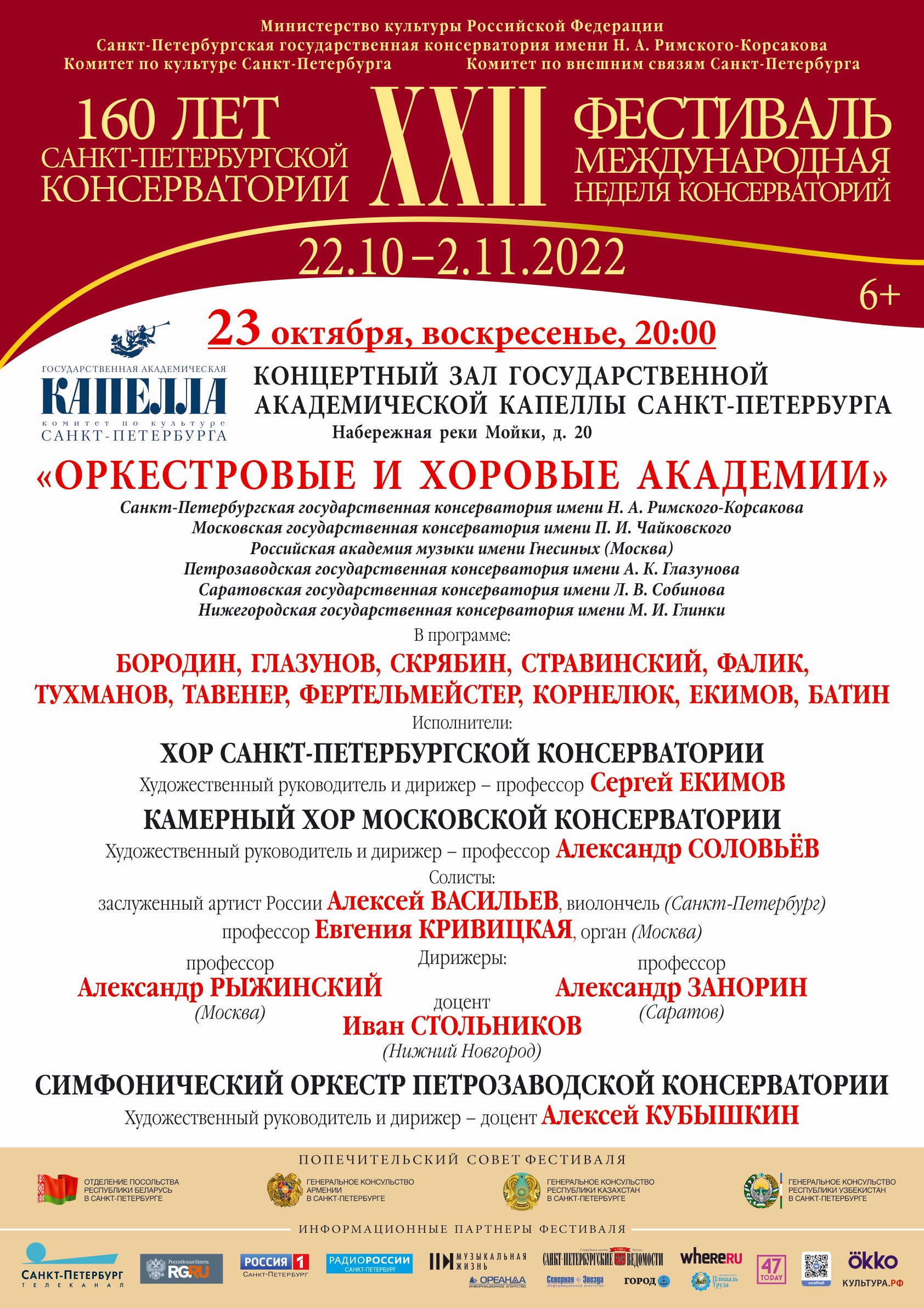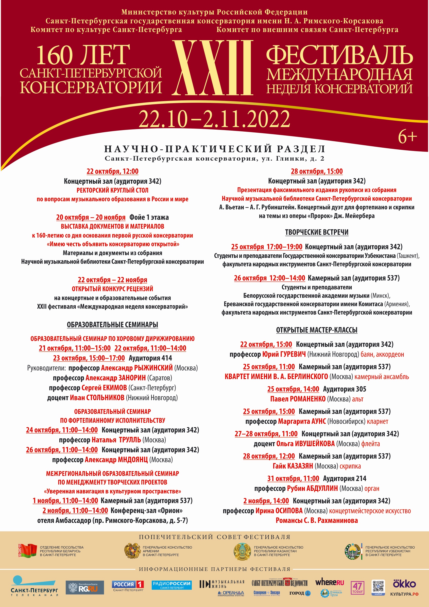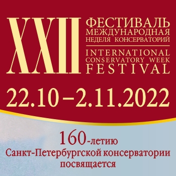 С 22 октября по 2 ноября 2022 в рамках программы юбилейных торжеств к 160-летию со дня своего основания, Санкт-Петербургская государственная консерватория имени Н. А. Римского-Корсакова проводит ХХII фестиваль «Международная неделя консерваторий».