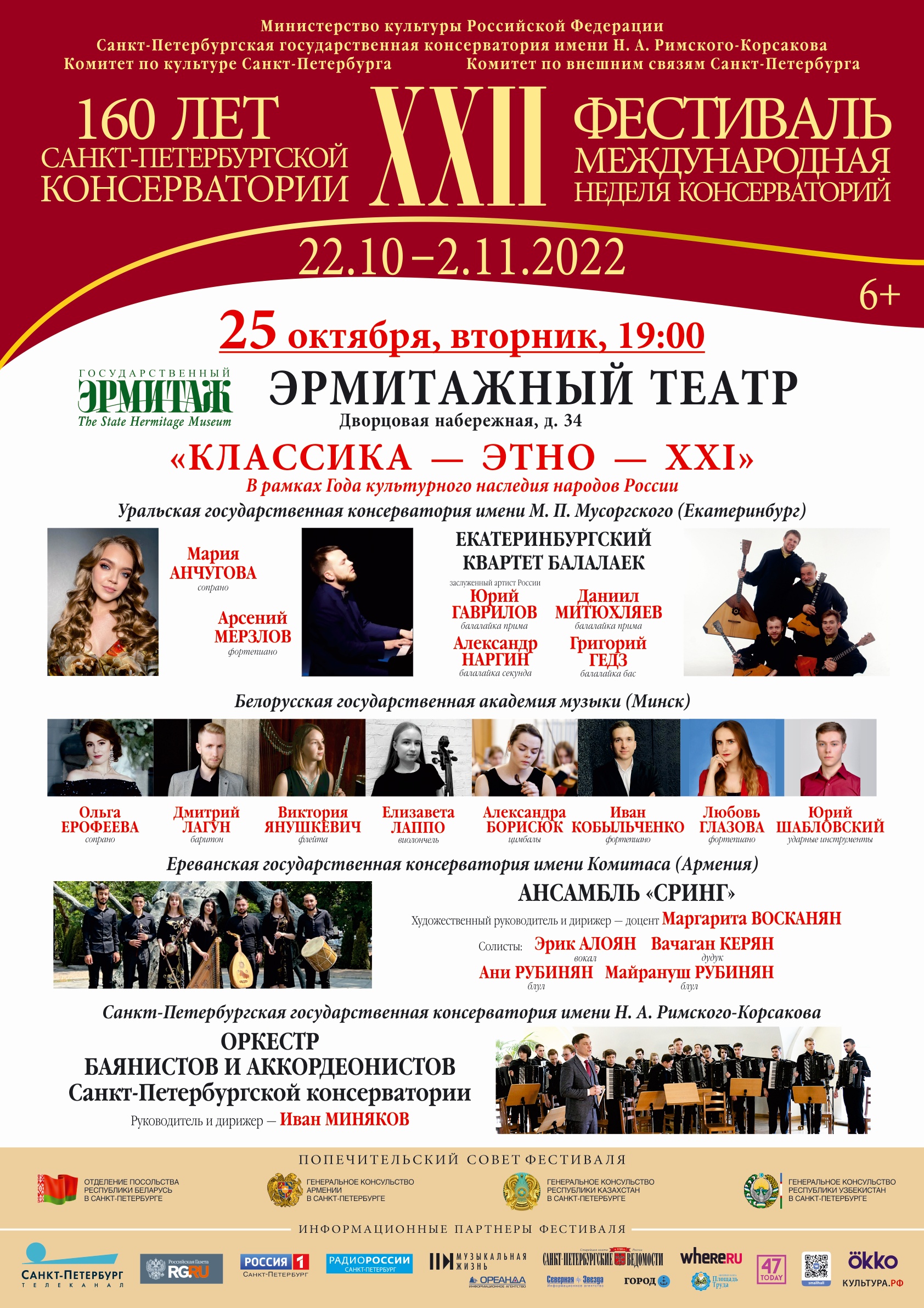 25 октября в историческом зале Эрмитажного театра в концертном марафоне «КЛАССИКА – ЭТНО – XXI», посвященном Году культурного наследия народов России, - своё искусство продемонстрируют представители российских и зарубежных Консерваторий.