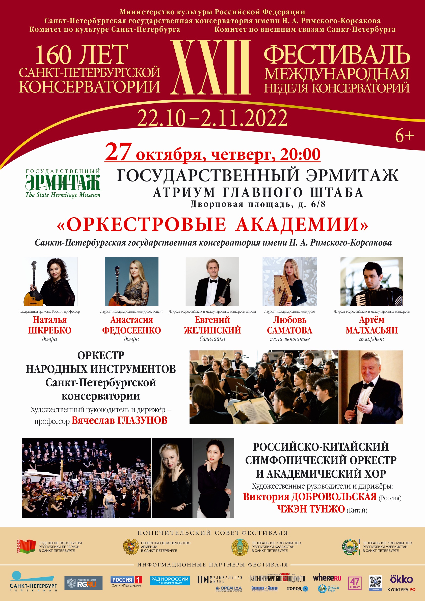 27 октября в Атриуме Главного штаба в цикле «Оркестровые академии» запланирована уникальная программа из русской академической и народной музыки, а также сочинений европейских и китайских композиторов. Герои вечера – Оркестр русских народных инструментов Санкт-Петербургской консерватории и недавно созданный Российско-китайский симфонический оркестр. Дирижеры: Вячеслав Глазунов, Илья Ситкин, Виктория Добровольская и Тунжо Чжэн.
