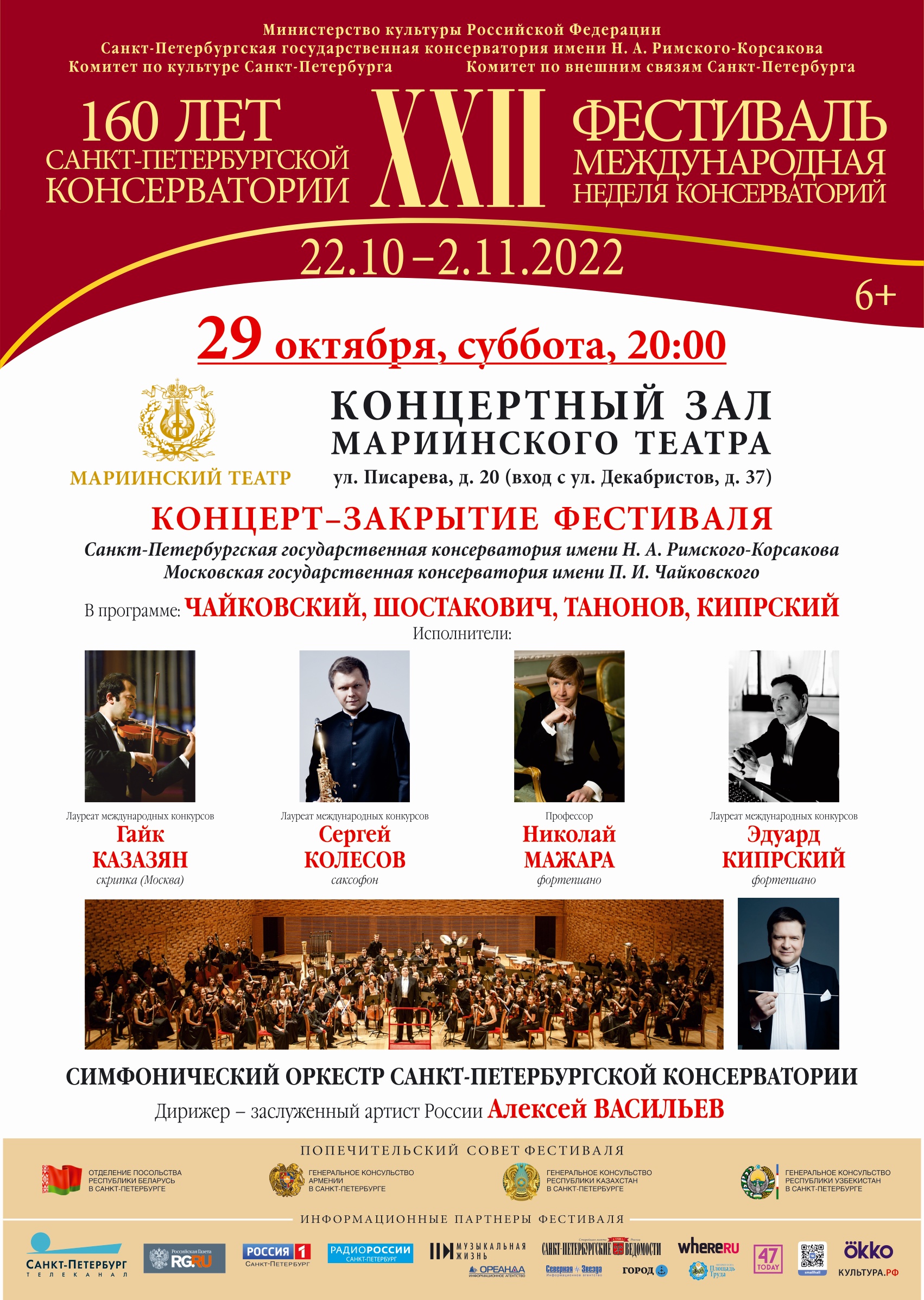 29 октября в 20 часов в Концертном зале Мариинского театра состоится Официальное закрытие Фестиваля. В рамках «Оркестровых академий» будет представлена программа инструментальных концертов, созданных выпускниками Санкт-Петербургской консерватории в разные периоды ее славной 160-летней истории. Исполнители: Симфонический оркестр и солисты Консерватории, дирижер – ректор, заслуженный артист РФ Алексей Васильев.