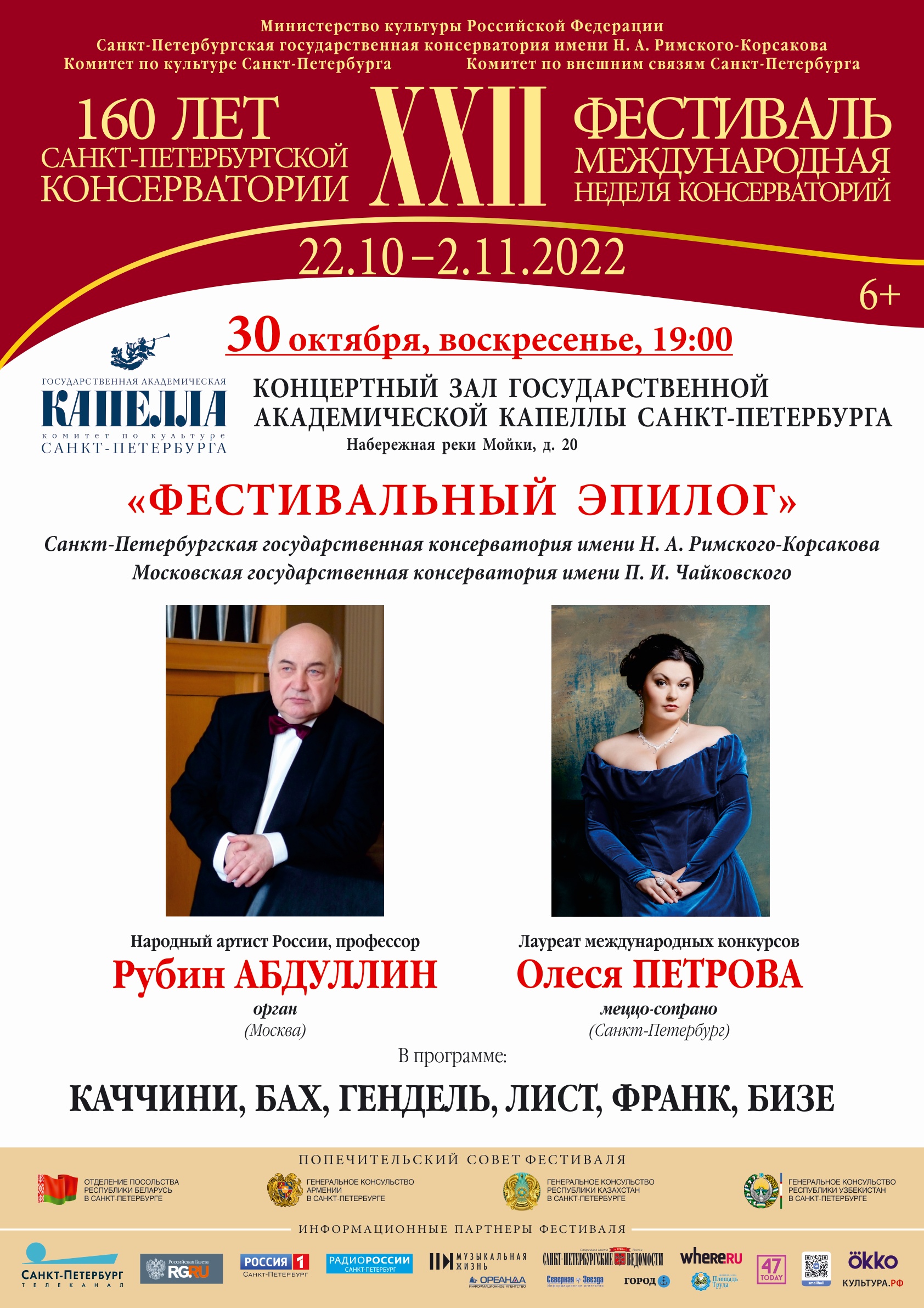 30 октября в Концертном зале Академической капеллы прозвучит Фестивальный эпилог. На сцене - заведующий кафедрой органа Московской консерватории, народный артист России Рубин Абдуллин и прославленная вокалистка, выпускница Санкт-Петербургской консерватории Олеся Петрова