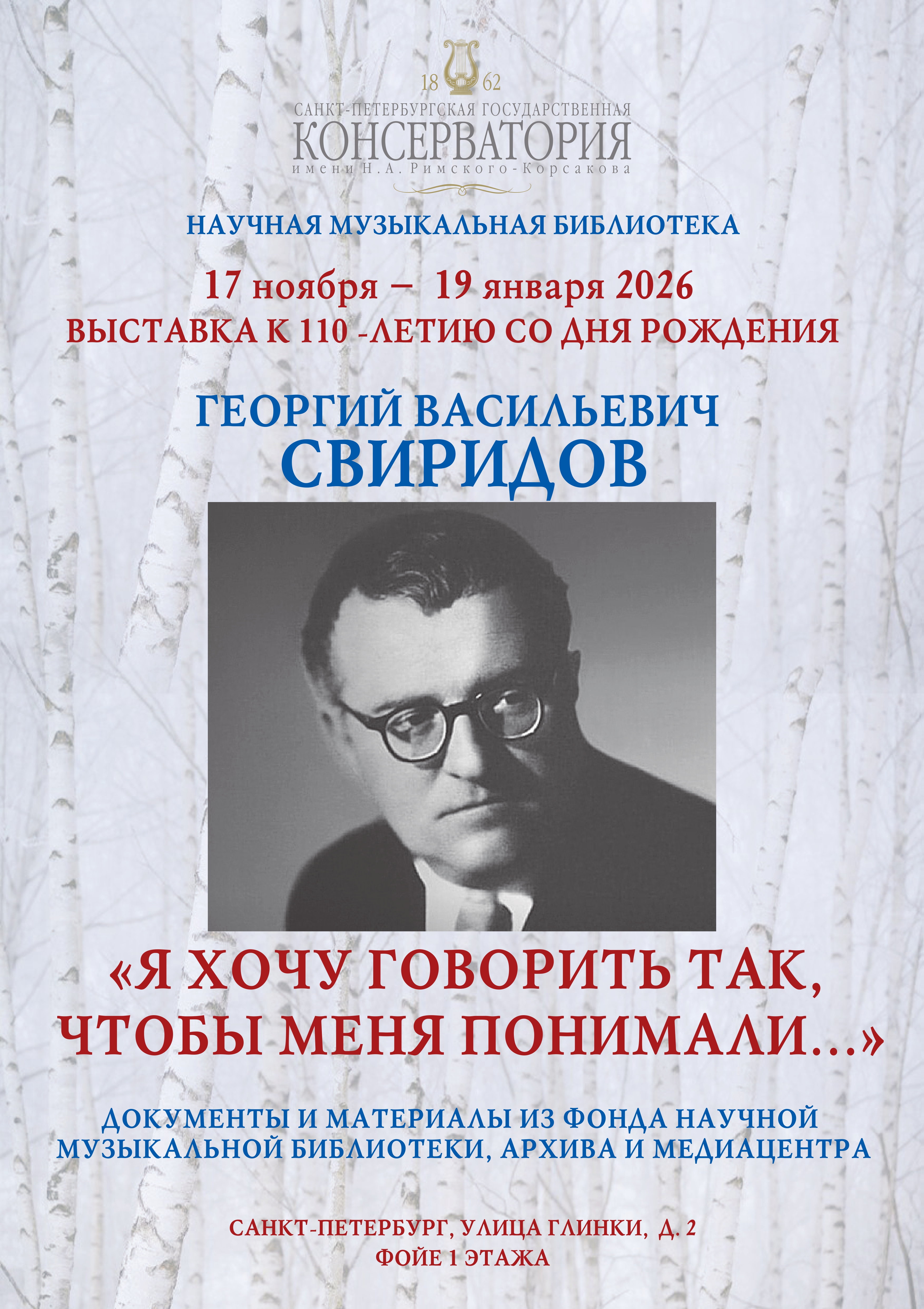 17 ноября Научная музыкальная библиотека открывает выставку, посвященную 160-летию со дня рождения выдающегося советского композитора, пианиста и общественного деятеля - Георгия Васильевича Свиридова. На выставке представлены материалы из фондов библиотеки, архива и медиацентра консерватории. Уникальным является Личное Дело студента Георгия Свиридова 1936 года, а также его переписка с профессором Ручьевской Е.А.
