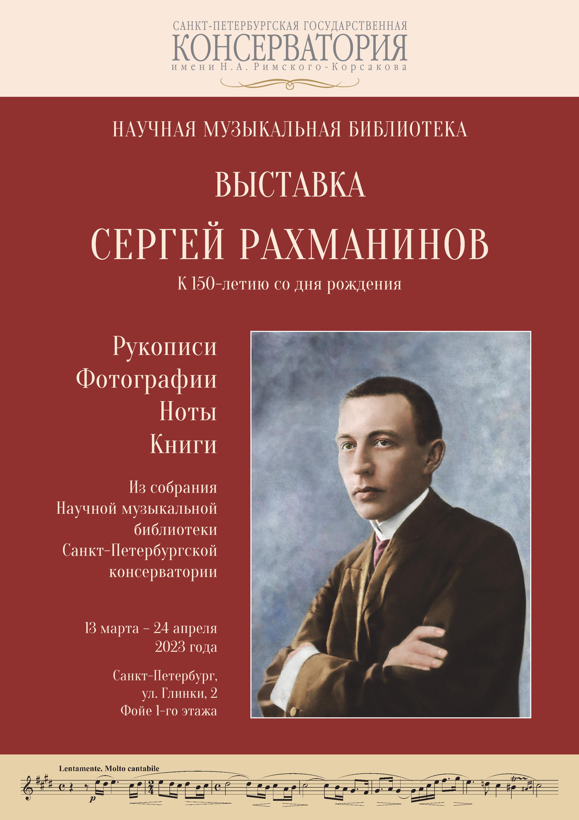 К 150-летию со дня рождения выдающегося русского композитора, пианиста, дирижера С. В. Рахманинова Научная музыкальная библиотека подготовила выставку материалов, представляющих документальное наследие композитора в собрании Санкт-Петербургской консерватории. Большинство экспонатов связаны с русским периодом творческой биографии С. В. Рахманинова: материалы, отражающие годы учебы в Санкт-Петербургской консерватории; письма в Попечительный совет и Дирекцию Императорского Русского Музыкального Общества, в частности, принцессе Е. Г. Саксен-Альтенбургской, Ф. И. Грусу, Н. В. Арцыбушеву, В. Э. Направнику. На выставке представлены прижизненные нотные и книжные издания: оперы, симфонии, камерная музыка композитора, очерки о творчестве; поздравительные телеграммы, фотографии коллег и оперных артистов, концертные программы исполнения музыки Рахманинова, материалы научных и просветительских мероприятий, труды российских и зарубежных исследователей.