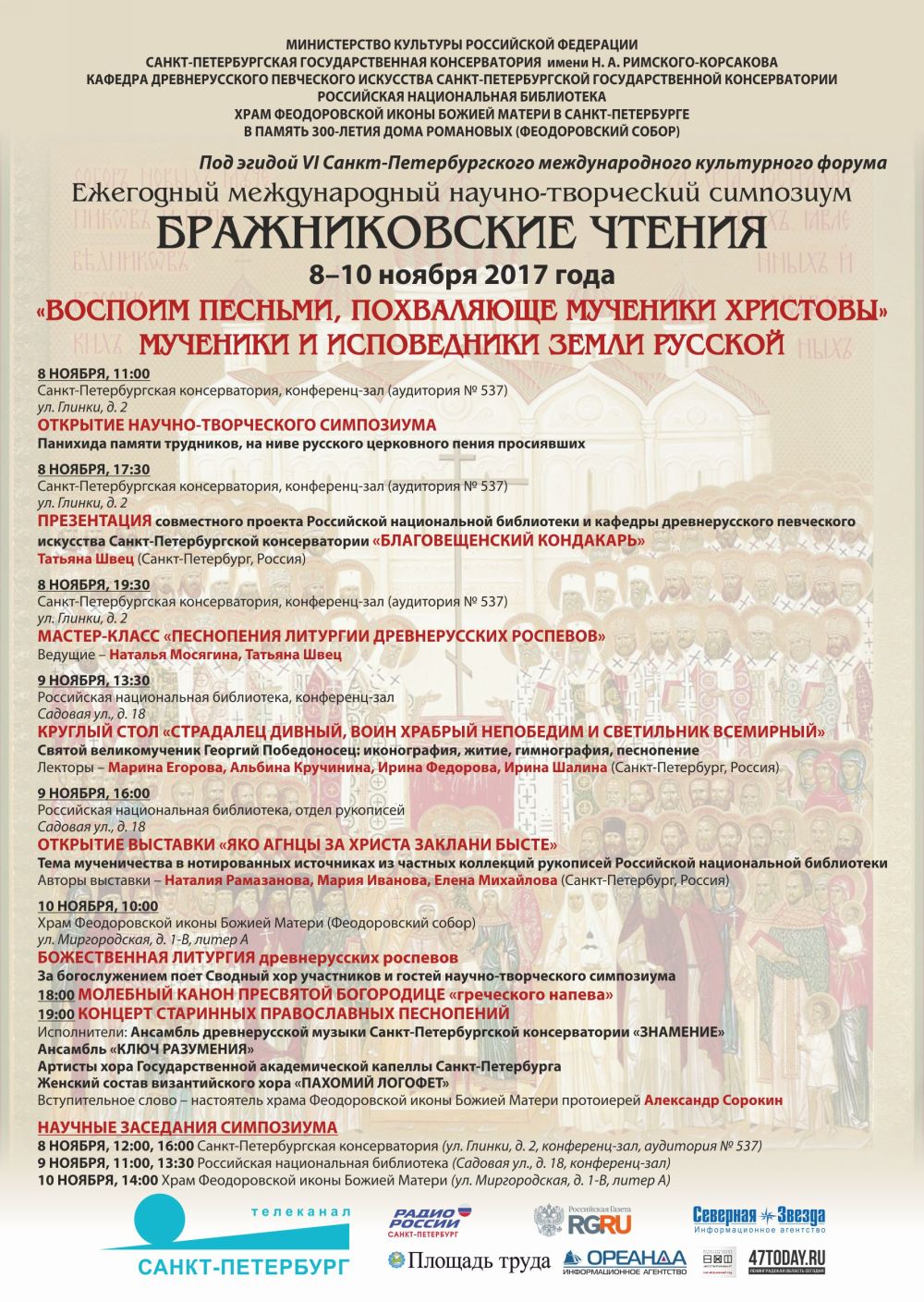 С 8 по 10 ноября 2017 года Санкт-Петербургская государственная консерватория в очередной раз проведет ежегодный международный научно-творческий симпозиум «Бражниковские чтения». Мероприятие проходит под эгидой VI Санкт-Петербургского Международного культурного форума. Тема симпозиума - мученики и исповедники Земли Русской. В год столетия событий Октябрьской революции эта тема приобретает особую актуальность.