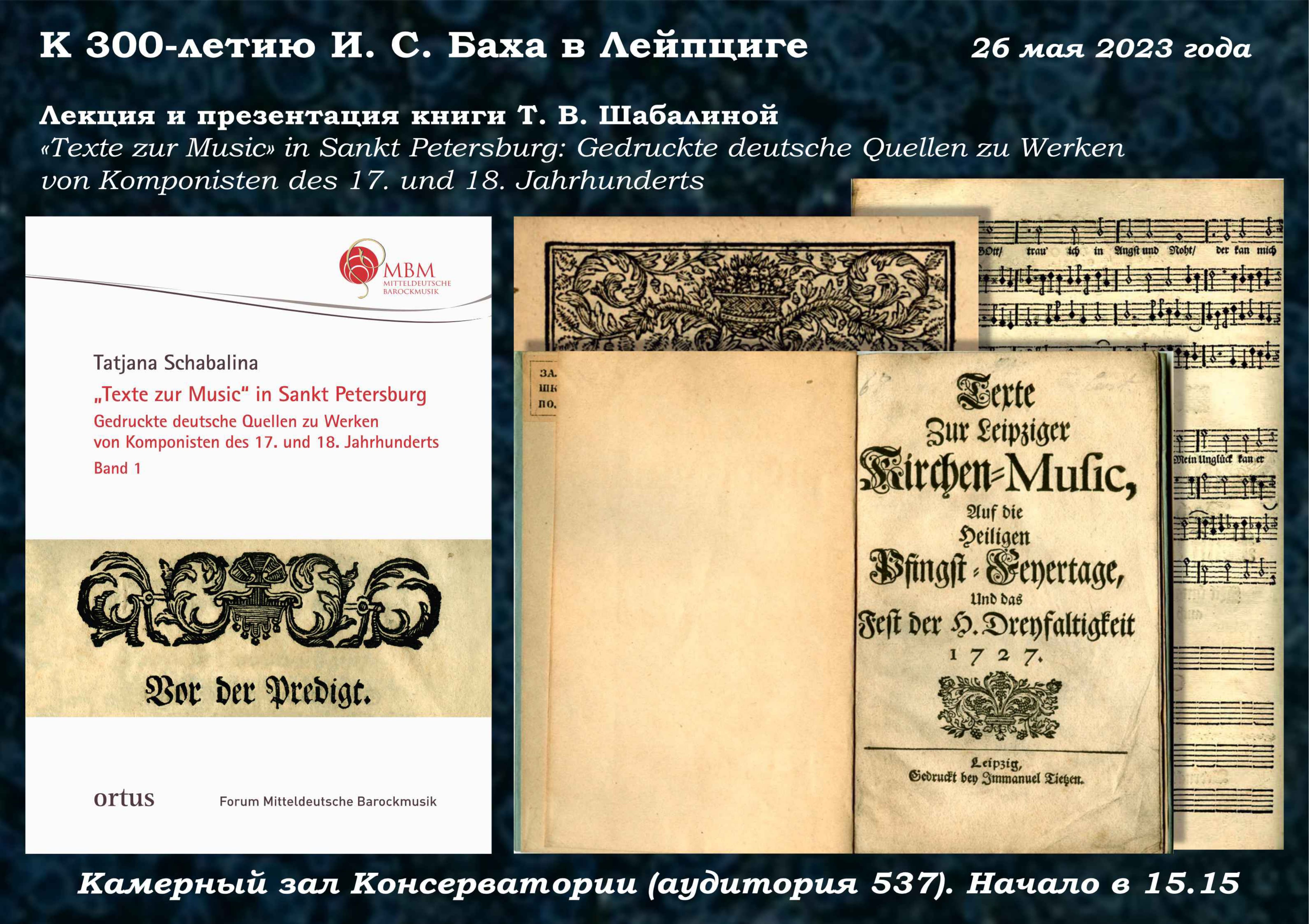 26 мая 2023 года в Конференц-зале (аудитория 537) состоится лекция и презентация книги доктора искусствоведения, профессора Санкт-Петербургской государственной консерватории, члена Международного Баховского общества (Германия), Международного Института Humanitas (Великобритания) и общества Bach Network UK Татьяны Васильевны Шабалиной «“Texte zur Music in Sankt Petersburg”: Gedruckte deutsche Quellen zu Werken von Komponisten des 17. und 18. Jahrhunderts». Лекция посвящена 300-летию вступления И. С. Баха в должность кантора школы Св. Фомы и начала творчества композитора в Лейпциге.
