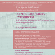 23 апреля 2018 года Научная музыкальная библиотека Санкт-Петербургской консерватории проводит XX Чтения отдела рукописей. Это ежегодная международная научная конференция, посвященная вопросам источниковедения и публикации, изучению архивов, рукописей, писем и других документов по истории музыкальной культуры. XX Чтения посвящаются 80-летию научно-исследовательского отдела рукописей (основан в 1938 году). В рамках конференции пройдут научное заседание и концерт. Начало конференции — в 11.00, аудитория 537. Начало концерта — в 19.00, аудитория 537.