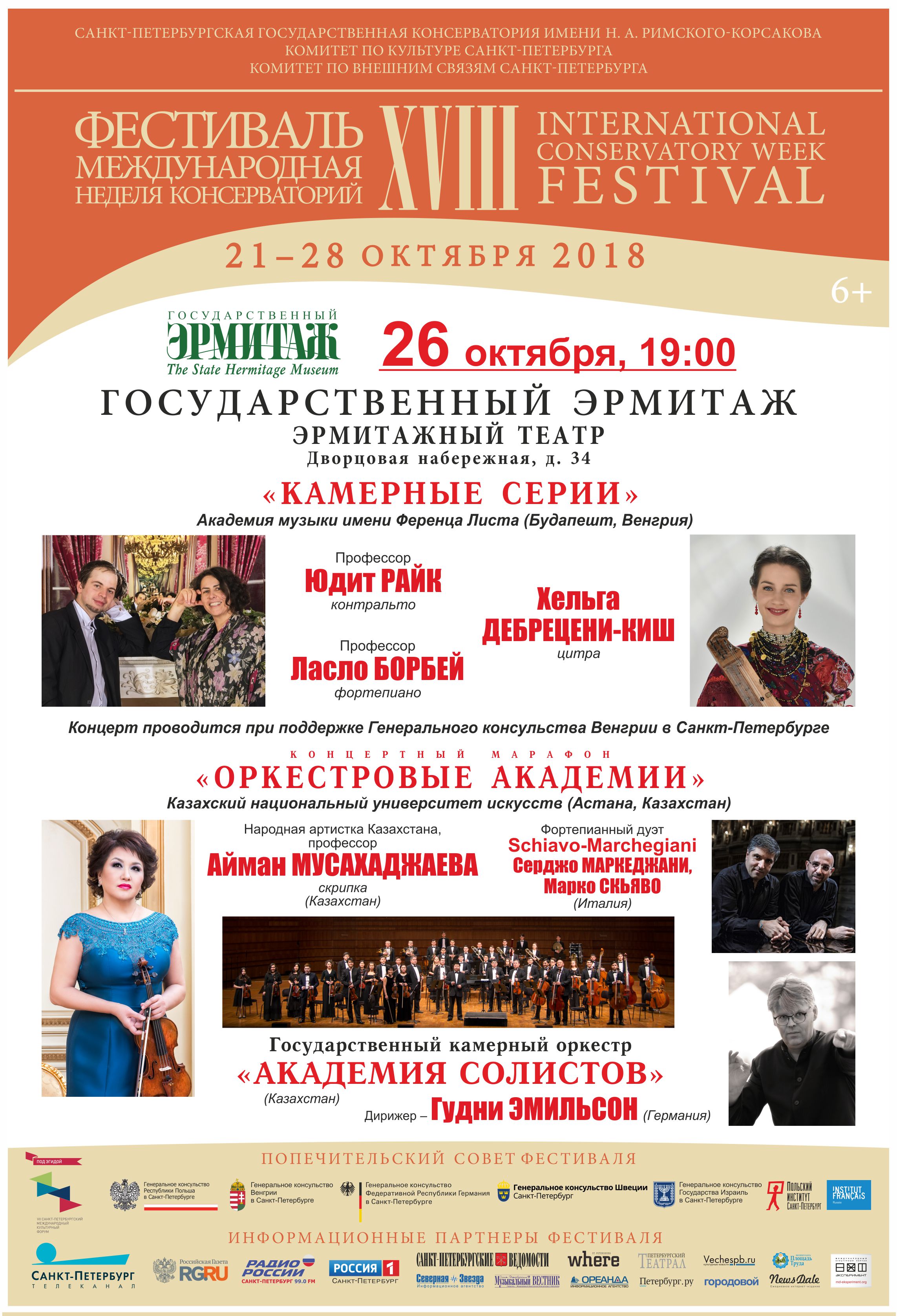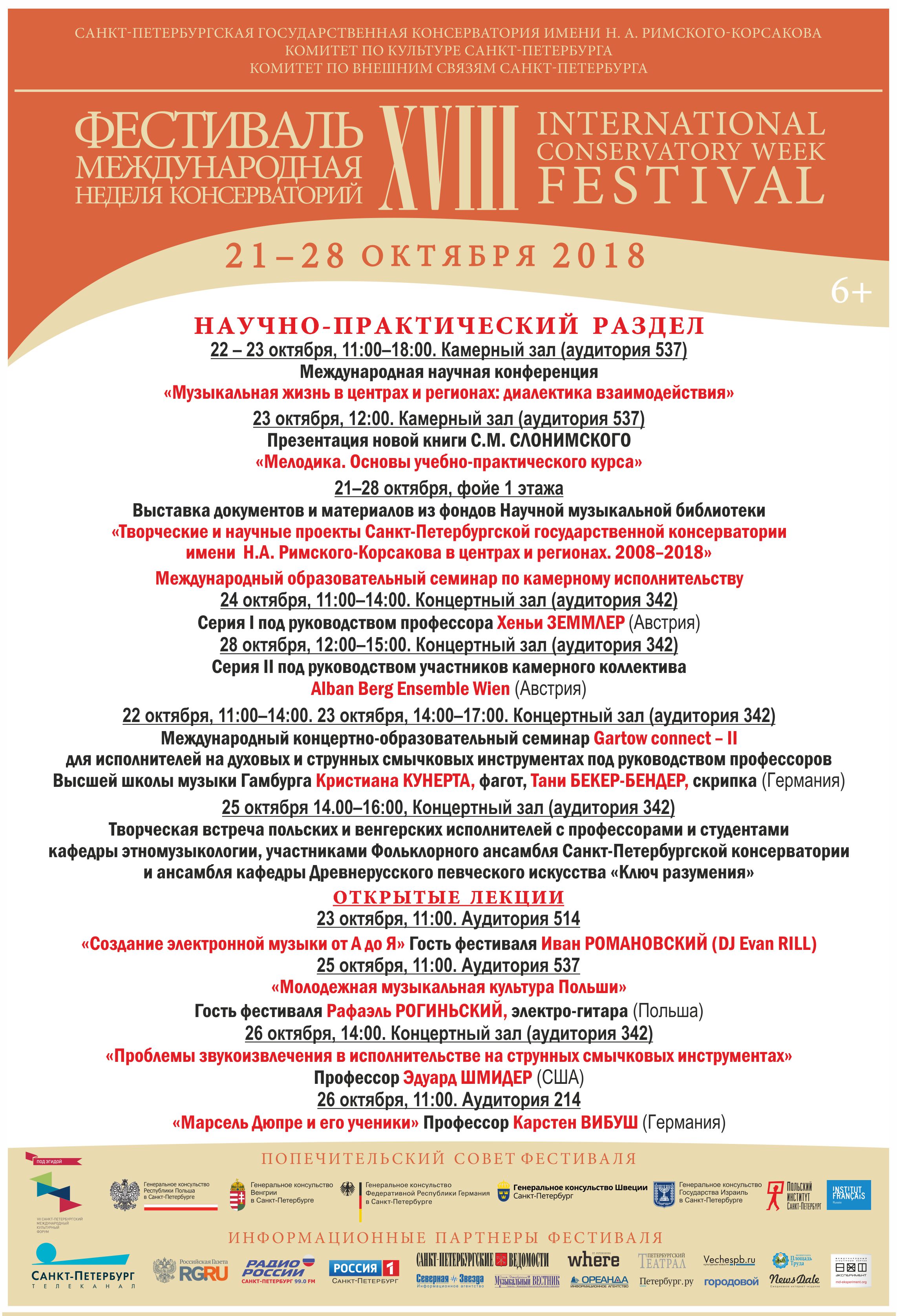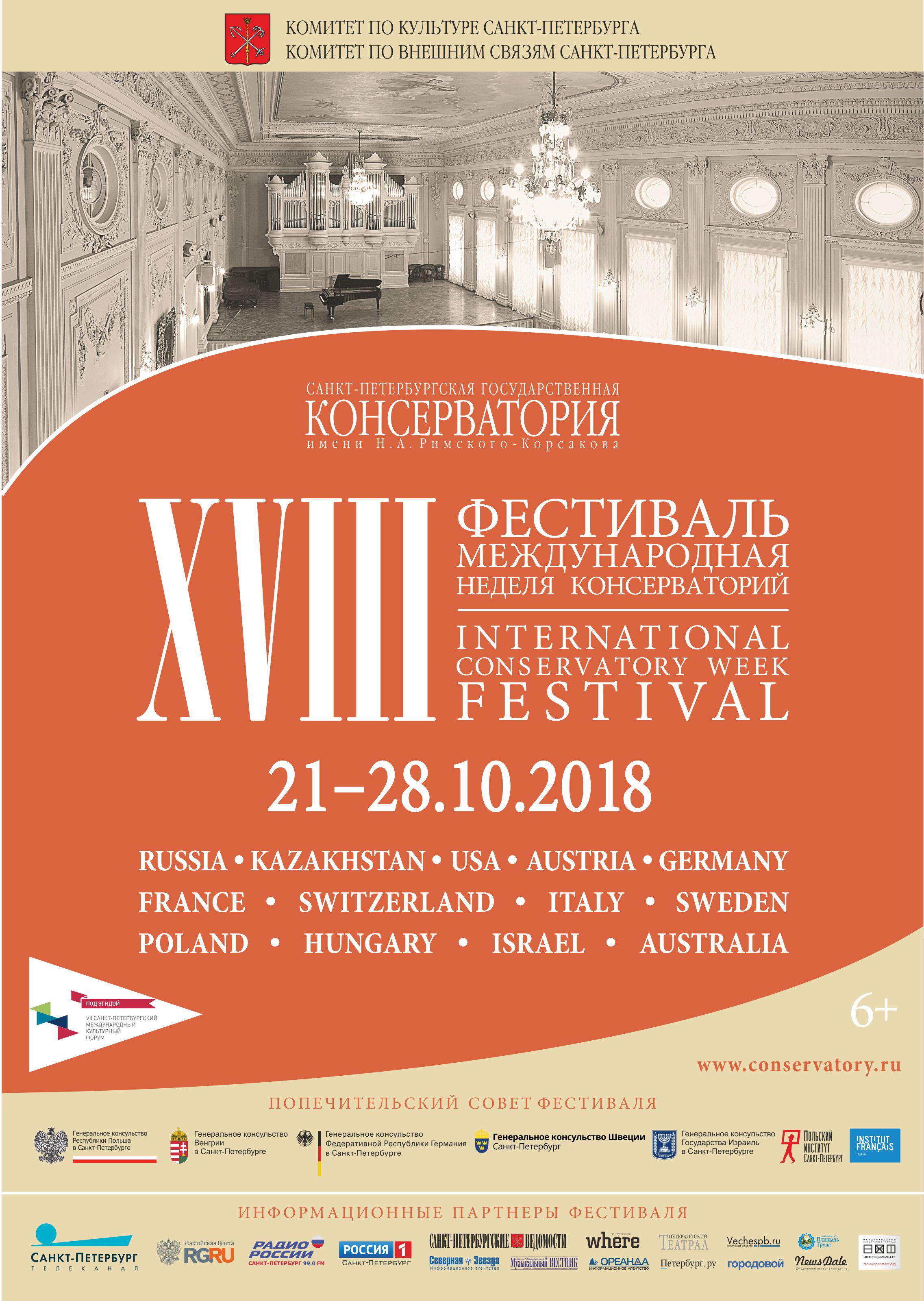 С 21 по 28 октября 2018 в Петербурге пройдет XVIII фестиваль «Международная неделя консерваторий», учрежденный Санкт-Петербургской государственной консерваторией имени Н.А. Римского-Корсакова в 2001 году. Проект, не имеющий аналогов в мировом музыкальном пространстве, за 17 лет представил более 270 высших школ музыки России, Европы, Северной и Южной Америки, Азии и Африки. Фестиваль проходит при поддержке Комитета по культуре и Комитета по внешним связям Санкт-Петербурга, под патронатом Попечительского совета, в состав которого вошли генеральные консульства и институты культуры стран-участниц. В программу глобального международного форума включены концертный и научно-образовательный разделы.