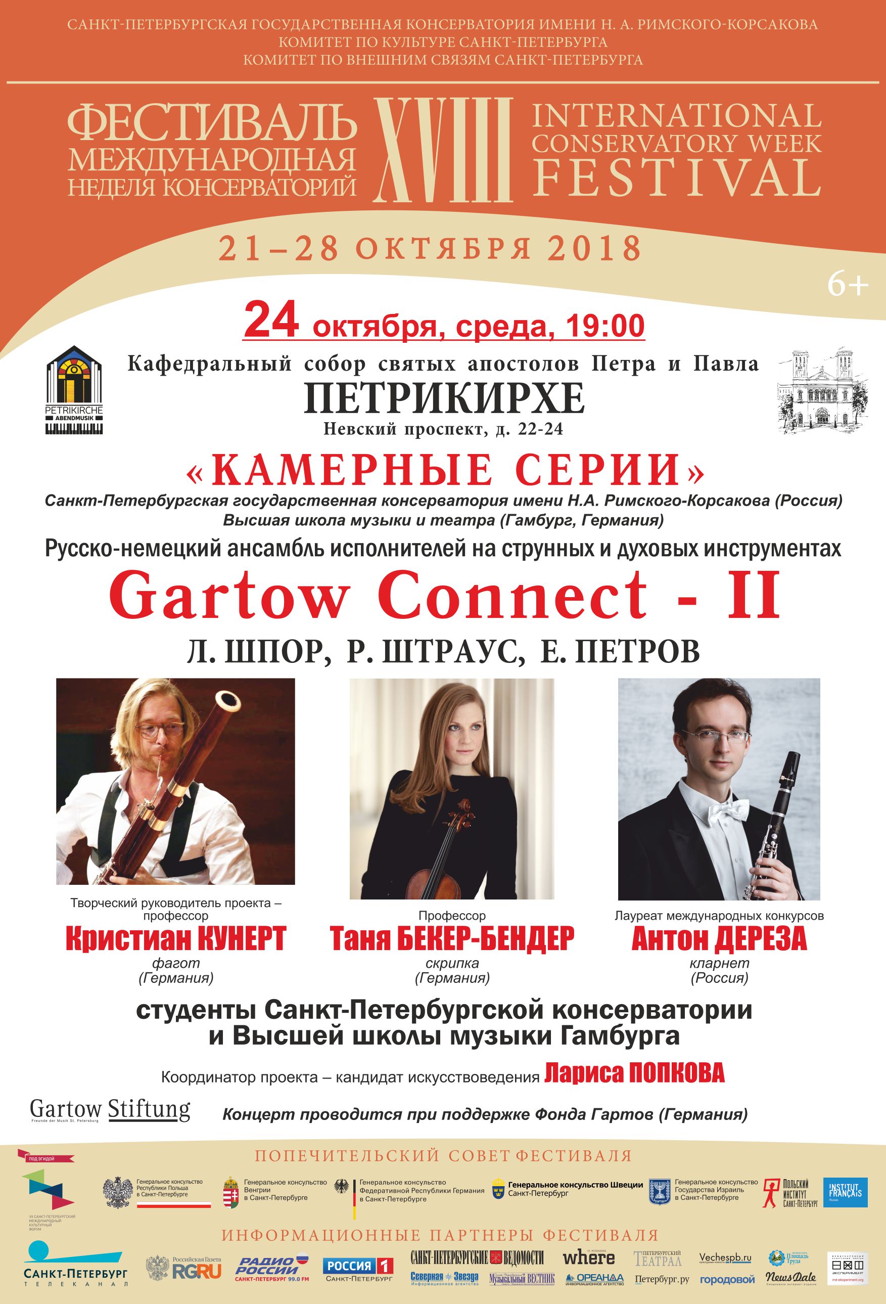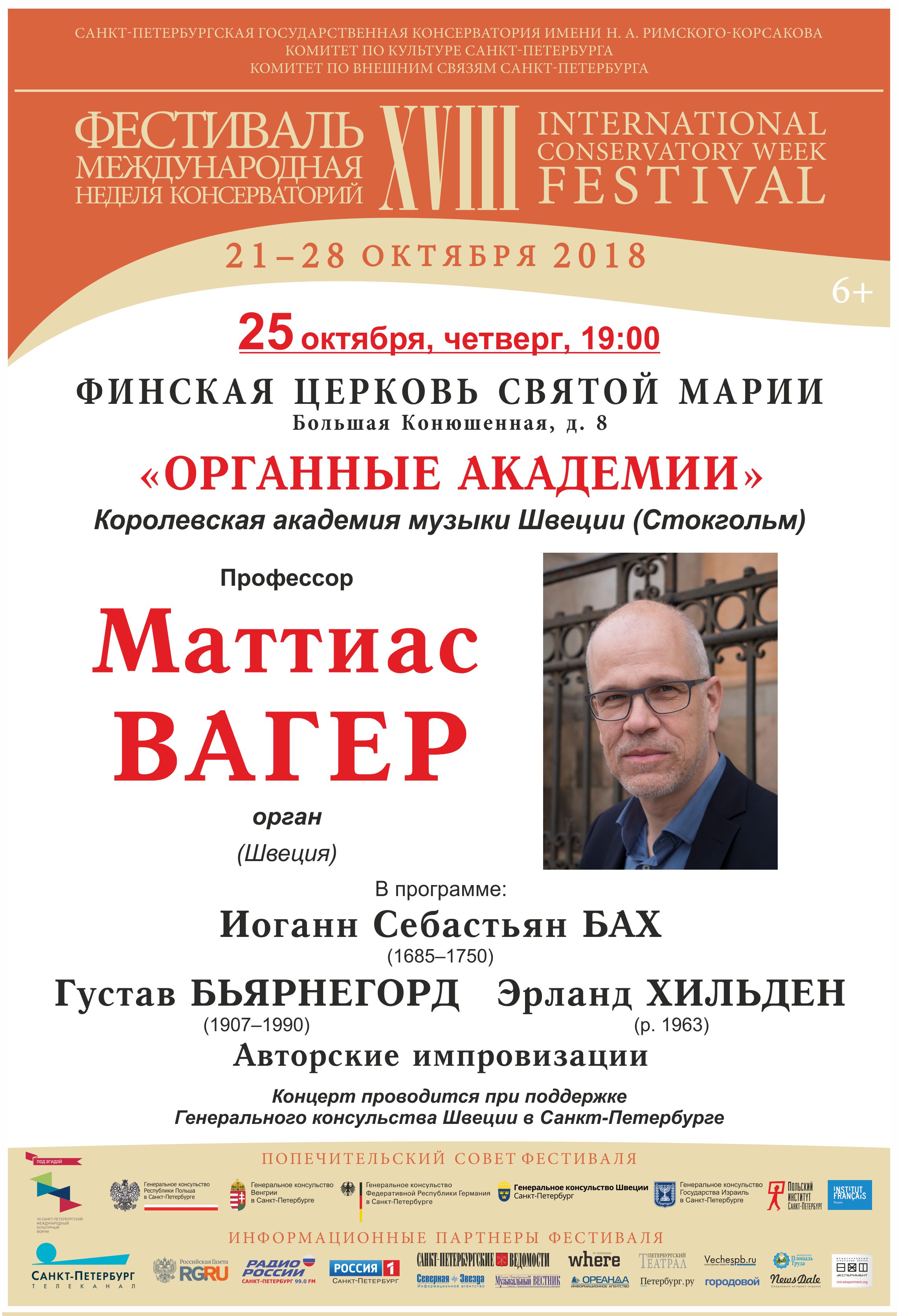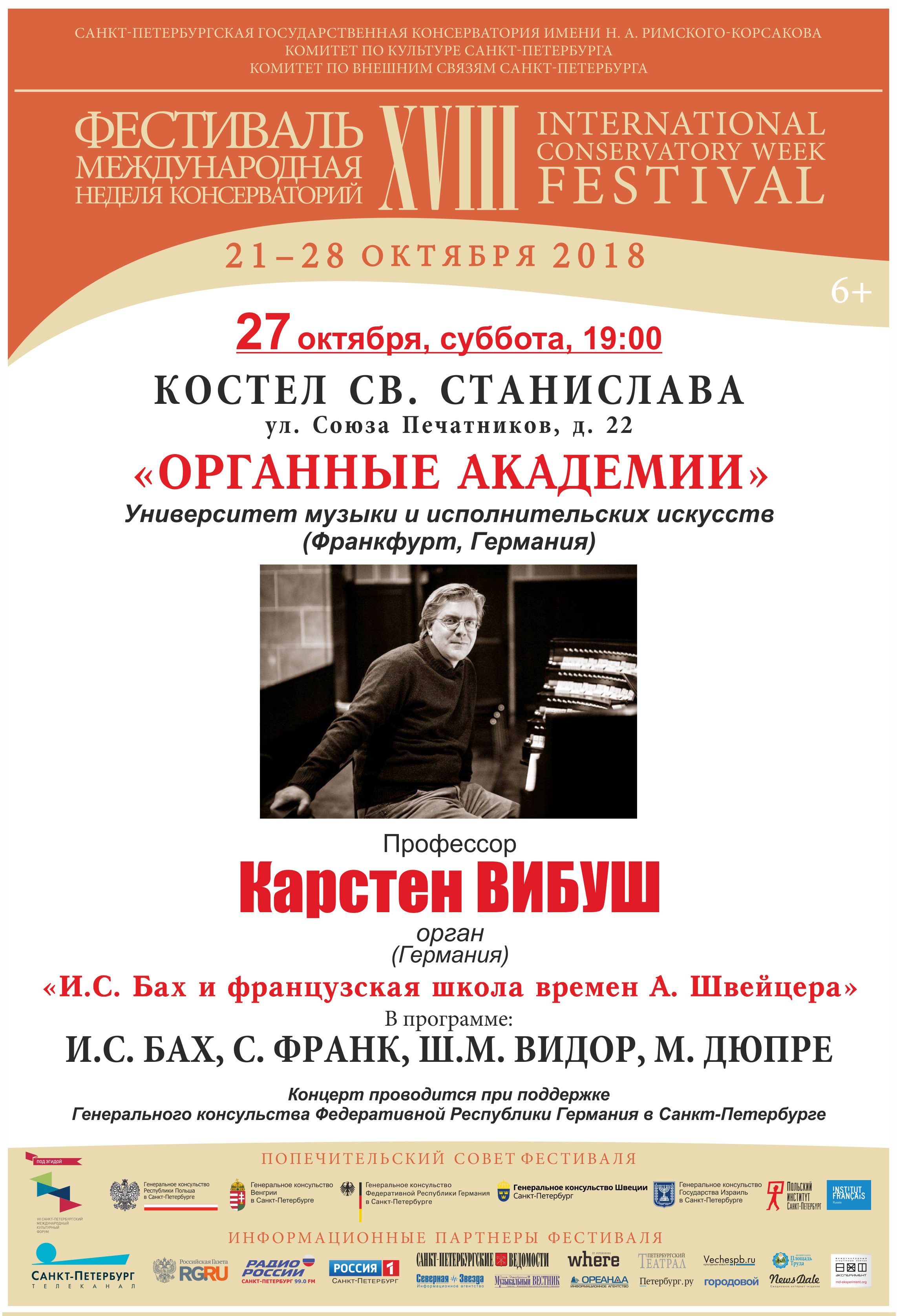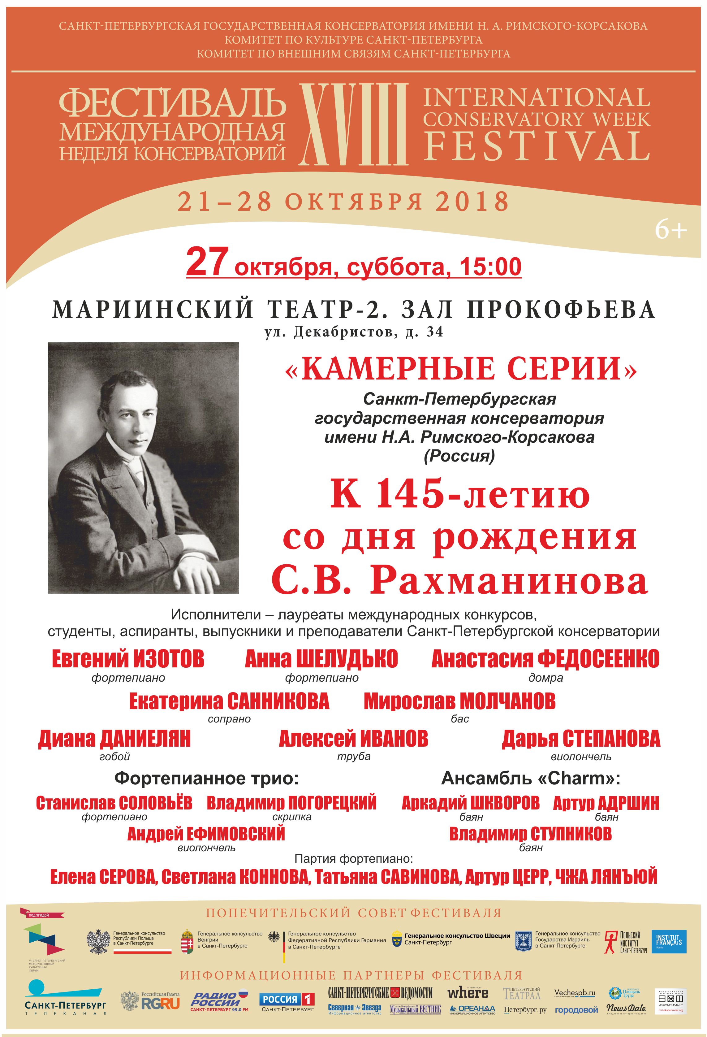 С 21 по 28 октября 2018 в Петербурге пройдет XVIII фестиваль «Международная неделя консерваторий», учрежденный Санкт-Петербургской государственной консерваторией имени Н.А. Римского-Корсакова в 2001 году. Проект, не имеющий аналогов в мировом музыкальном пространстве, за 17 лет представил более 270 высших школ музыки России, Европы, Северной и Южной Америки, Азии и Африки. Фестиваль проходит при поддержке Комитета по культуре и Комитета по внешним связям Санкт-Петербурга, под патронатом Попечительского совета, в состав которого вошли генеральные консульства и институты культуры стран-участниц. В программу глобального международного форума включены концертный и научно-образовательный разделы.