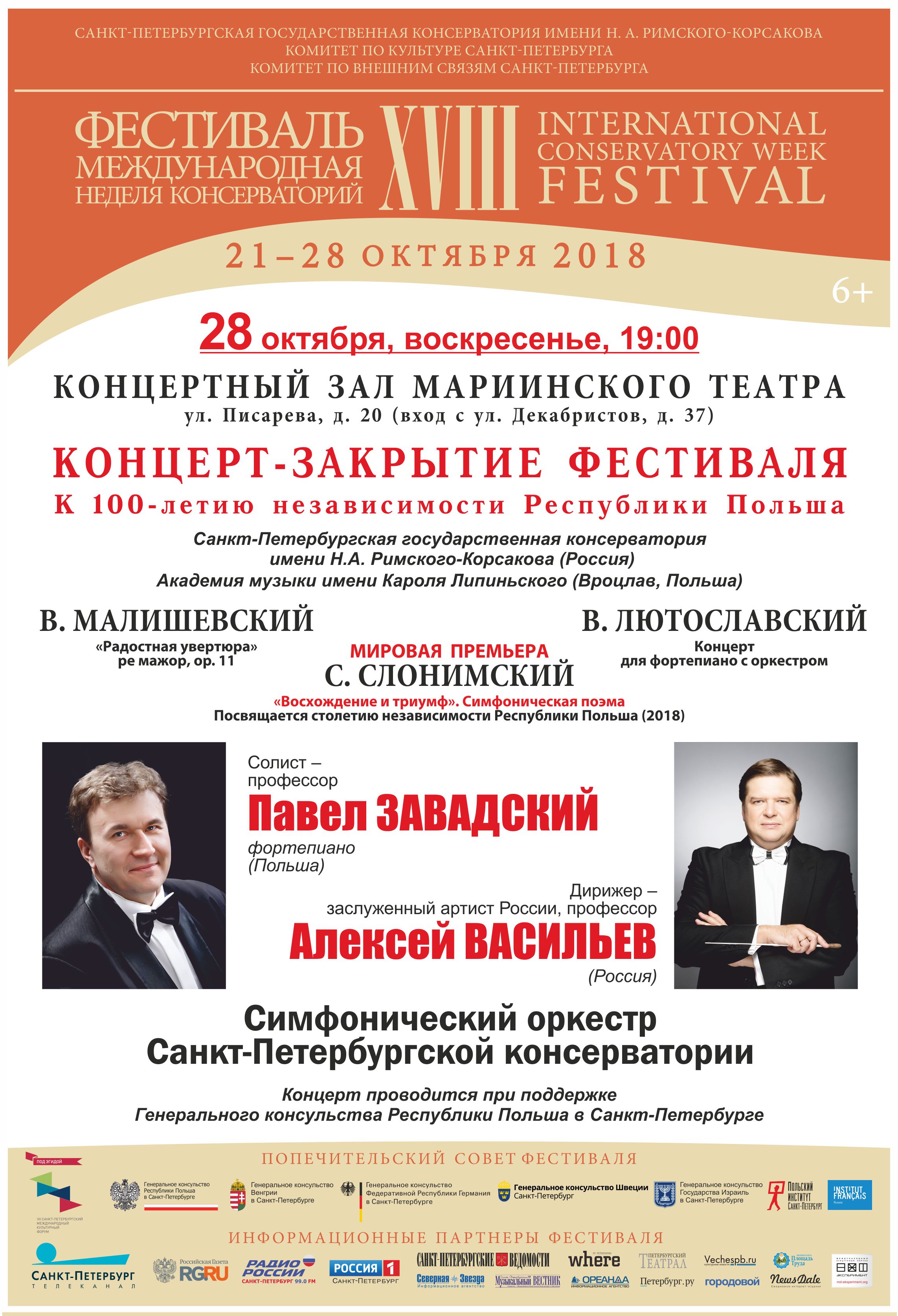 28 октября Фестиваль завершится в Концертном зале Мариинского театра, где будут представлены сочинения польских композиторов ХХ века Витольда Малишевского и Витольда Лютославского, а также мировая премьера Симфонической поэмы Сергея Слонимского, посвященная 100-летию независимости Республики Польша. Исполнители – Симфонический оркестр Санкт-Петербургской консерватории под управлением ректора Алексея Васильева. Солист – Павел Завадский, Польша. Научно-образовательная часть проекта включает в себя многочисленные разделы, среди которых: Международная научная конференция «Музыкальная жизнь в центрах и регионах: диалектика взаимодействия», выставка документов из фондов научной музыкальной библиотеки Санкт-Петербургской консерватории, международные образовательные семинары по камерному исполнительству, а также творческие встречи, открытые лекции и мастер-классы известных преподавателей из высших школ Европы, США и Австралии