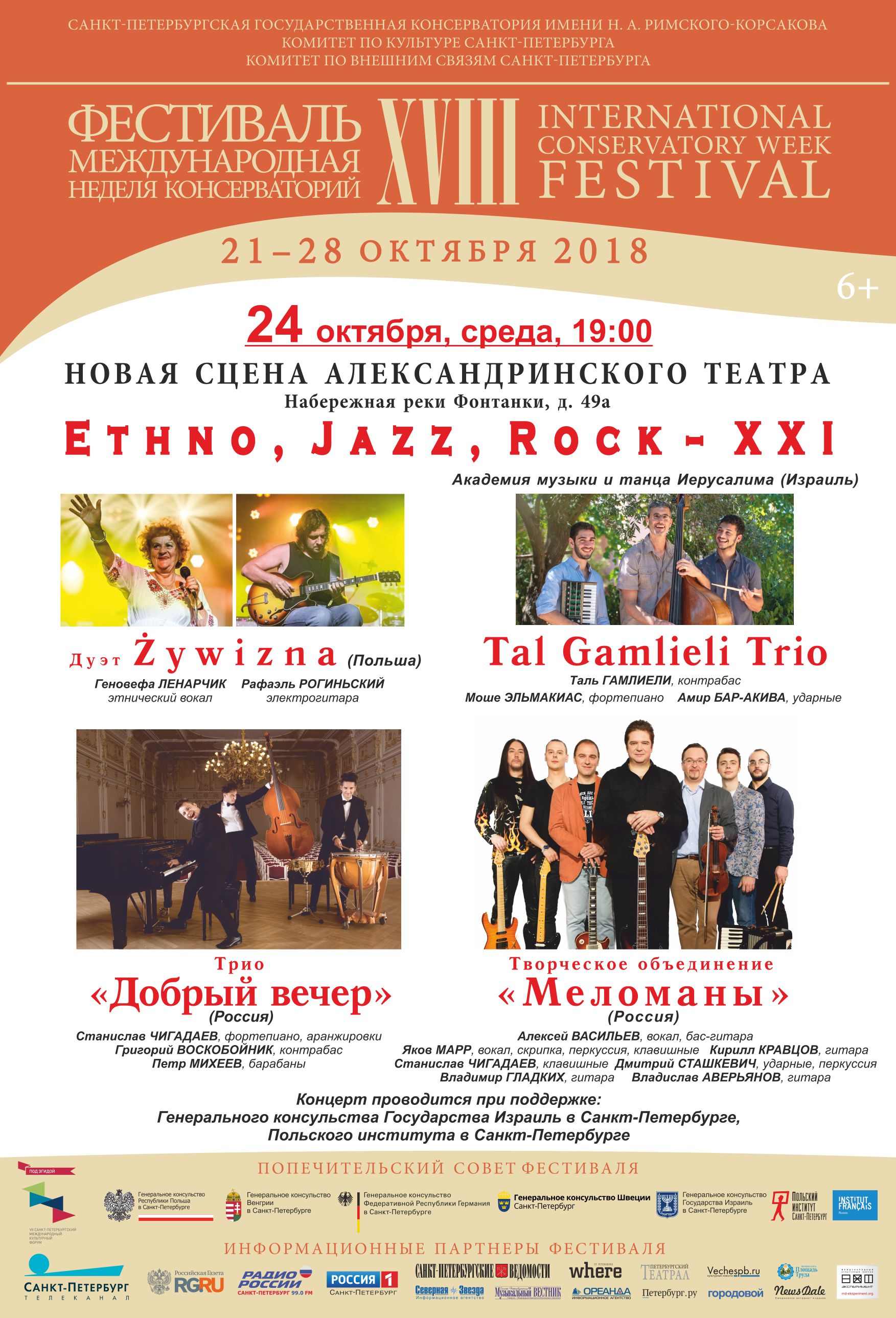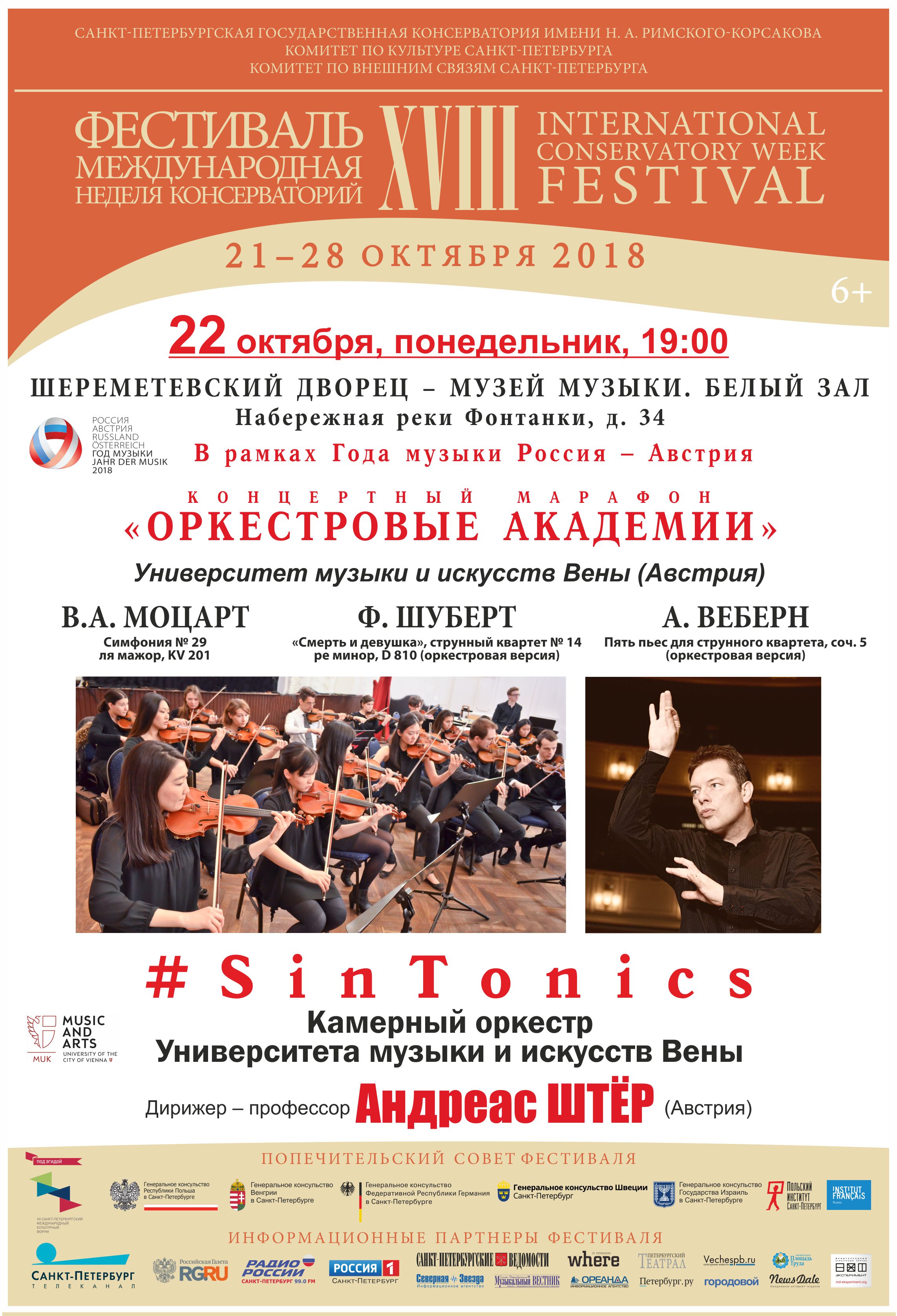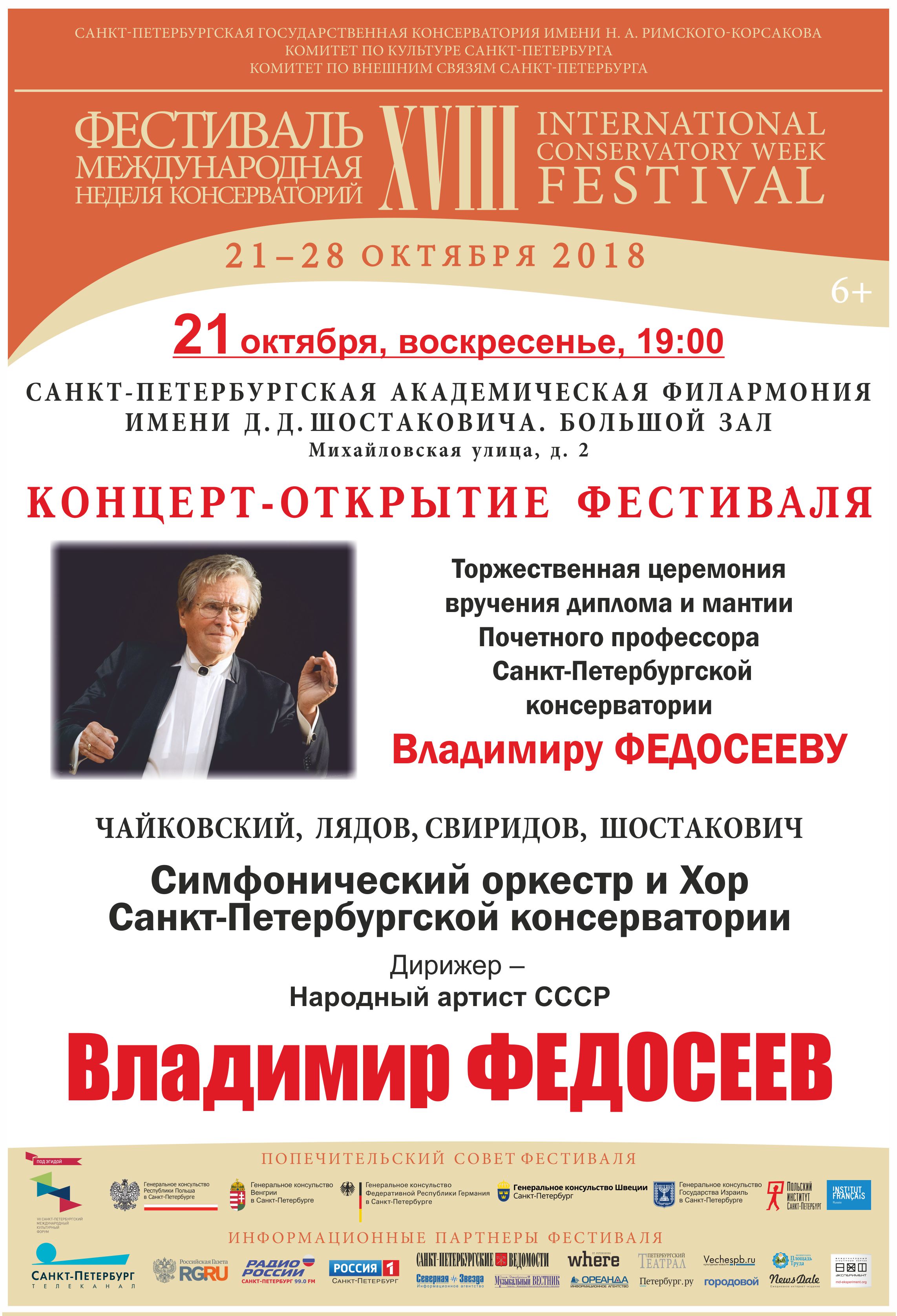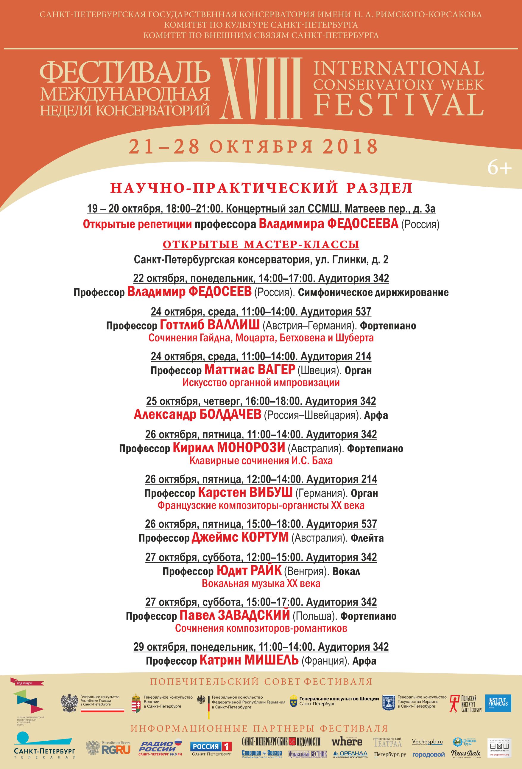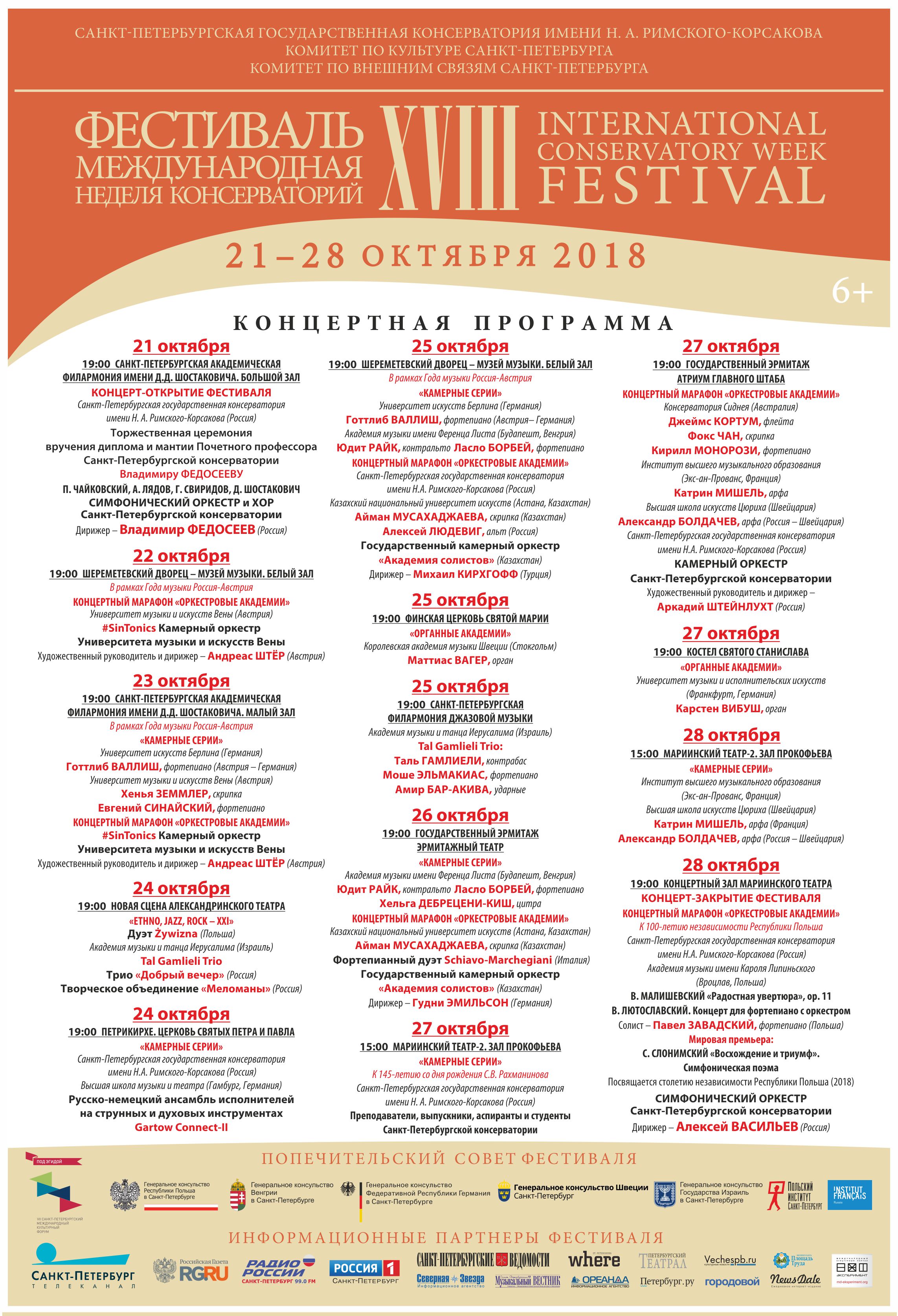 Фестиваль стартует 21 октября 2018 в Большом зале Санкт-Петербургской филармонии имени Д.Д. Шостаковича. В программе – сочинения Чайковского, Шостаковича и Свиридова. Исполнители – Хор и Симфонический оркестр Санкт-Петербургской консерватории под управлением народного артиста СССР Владимира Федосеева. На торжественной официальной церемонии маэстро будут вручены диплом и мантия Почетного профессора старейшей консерватории России. Масштабный проект «Оркестровые академии» представит пять симфонических и камерных оркестровых коллективов высших школ музыки России, Казахстана и Австрии. В разделе «Камерные серии» состоятся концерты с участием французских, немецких и русских музыкантов. В рамках «Органных академий» свое искусство продемонстрирует Карстен Вибуш. (Германия). Яркое событие концертной афиши – выступления выдающейся французской арфистки Катрин Мишель. Инновационная программа Ethno, Jazz, Rock XXI адресована молодежной аудитории. 24 октября на Новой сцене Александринского театра – исполнители этнической музыки из Польши и популярный гитарист Рафаэль Рогиньский, российские и израильские джазовые музыканты. Впервые в фестивальной программе ректор Санкт-Петербургской консерватории Алексей Васильев выступит в неакадемическом формате (вокал, бас-гитара), в составе творческого объединения «Меломаны»