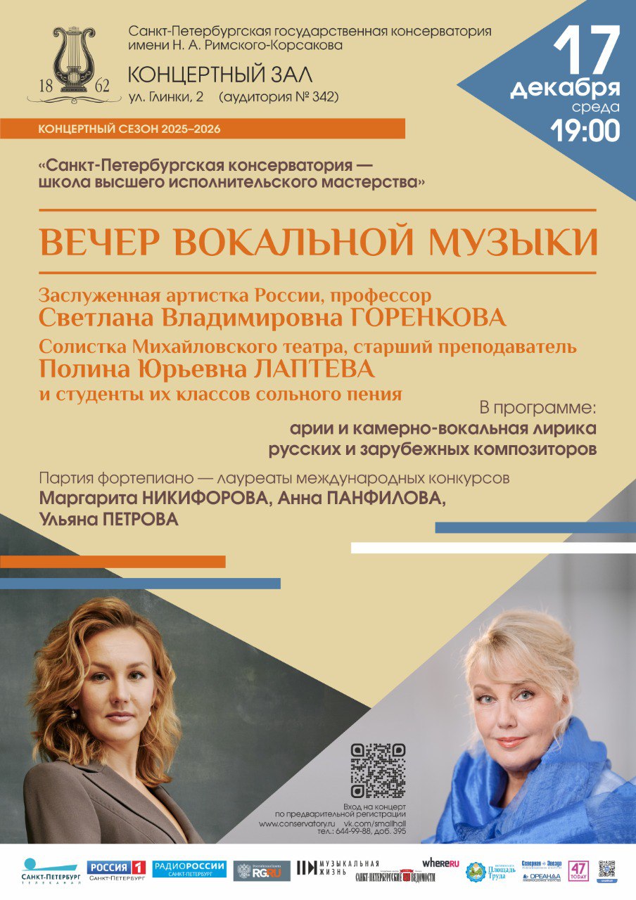 Героями концерта рубрики «Санкт-Петербургская консерватория — школа высшего исполнительского мастерства» станут заслуженная артистка России, профессор Светлана Владимировна Горенкова и солистка Михайловского театра, старший преподаватель Полина Юрьевна Лаптева. На сцене Концертного зала Санкт-Петербургской консерватории студенты их классов сольного пения представят вокальные сочинения признанных русских и зарубежных композиторов.