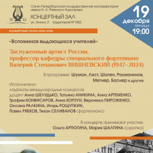 Героем вечера камерной музыки станет заслуженный артист России Валерий Степанович Вишневский (1947–2024). Почтить память профессора на сцену выйдут коллеги и выпускники профессора, которые исполнят сочинения для сольного фортепиано, а также камерные ансамбли.