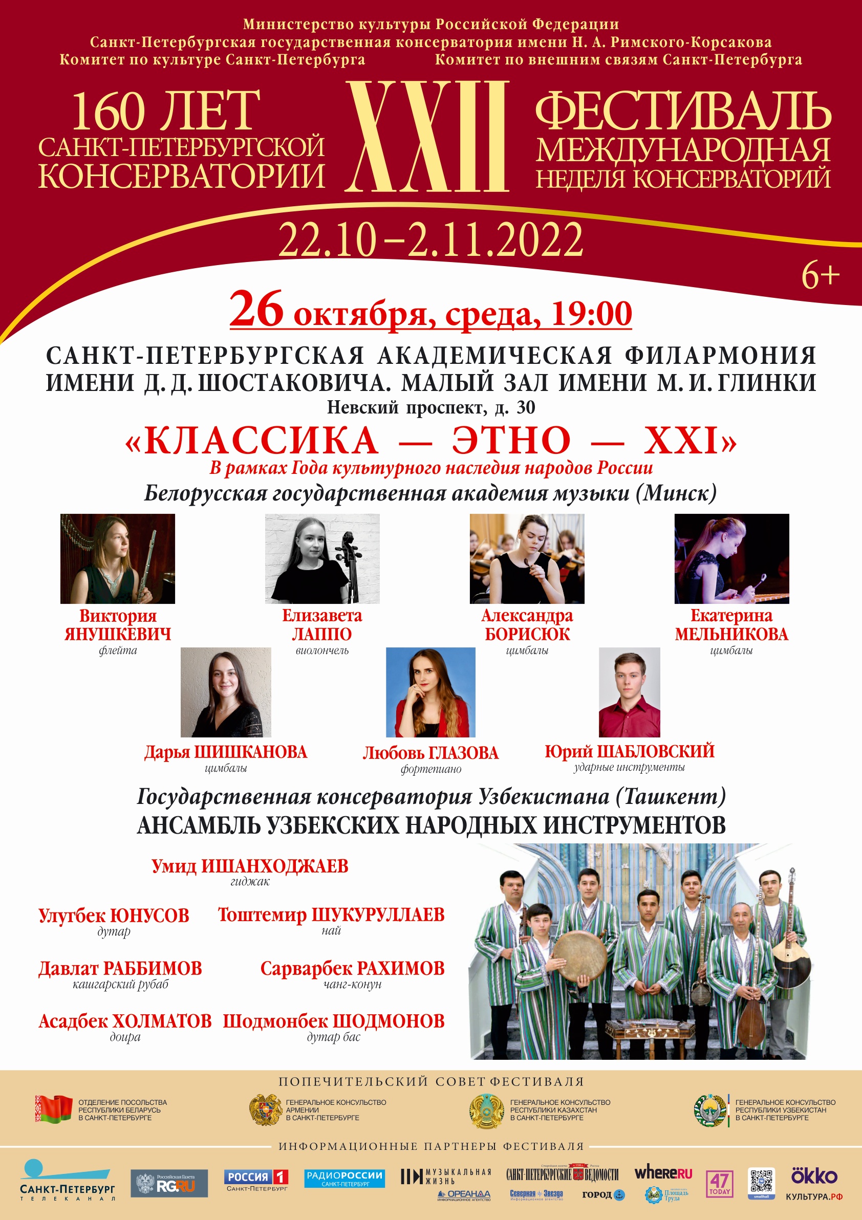 25 октября в историческом зале Эрмитажного театра в концертном марафоне «КЛАССИКА – ЭТНО – XXI», посвященном Году культурного наследия народов России, - своё искусство продемонстрируют представители российских и зарубежных Консерваторий.