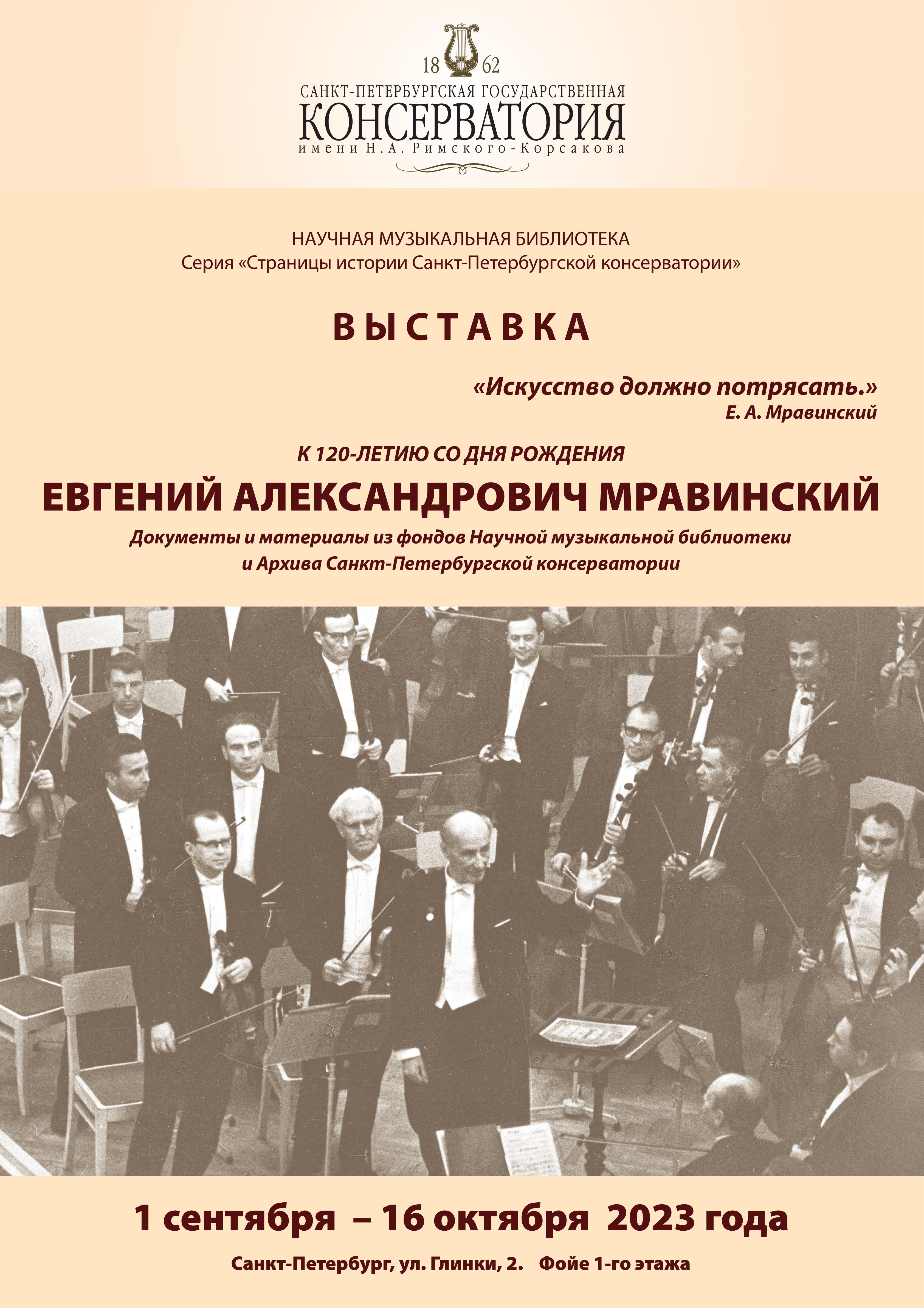 Документальная выставка, посвященная Е. А. Мравинскому, создана в рамках серии «Страницы истории Санкт-Петербургской консерватории» и представляет фотографии, архивные документы, концертные программы, афиши и книги из фондов Научной музыкальной библиотеки и архива Санкт-Петербургской государственной консерватории имени Н. А. Римского-Корсакова, а также аудиозаписи и видеофильм из фондов Медиацентра Санкт-Петербургской консерватории. Впервые экспонируются документы из личного дела Е. А. Мравинского, хранящегося в архиве Санкт-Петербургской консерватории, концертные программы Ленинградской филармонии, связанные с именем Е. А. Мравинского, из коллекции концертных и театральных программ А. В. Предтеченского, историка, профессора, доктора исторических наук. Также впервые представлены документы и материалы из собрания Л. К. Лейбенкрафта, скрипача Заслуженного коллектива РСФР академического Симфонического оркестра.