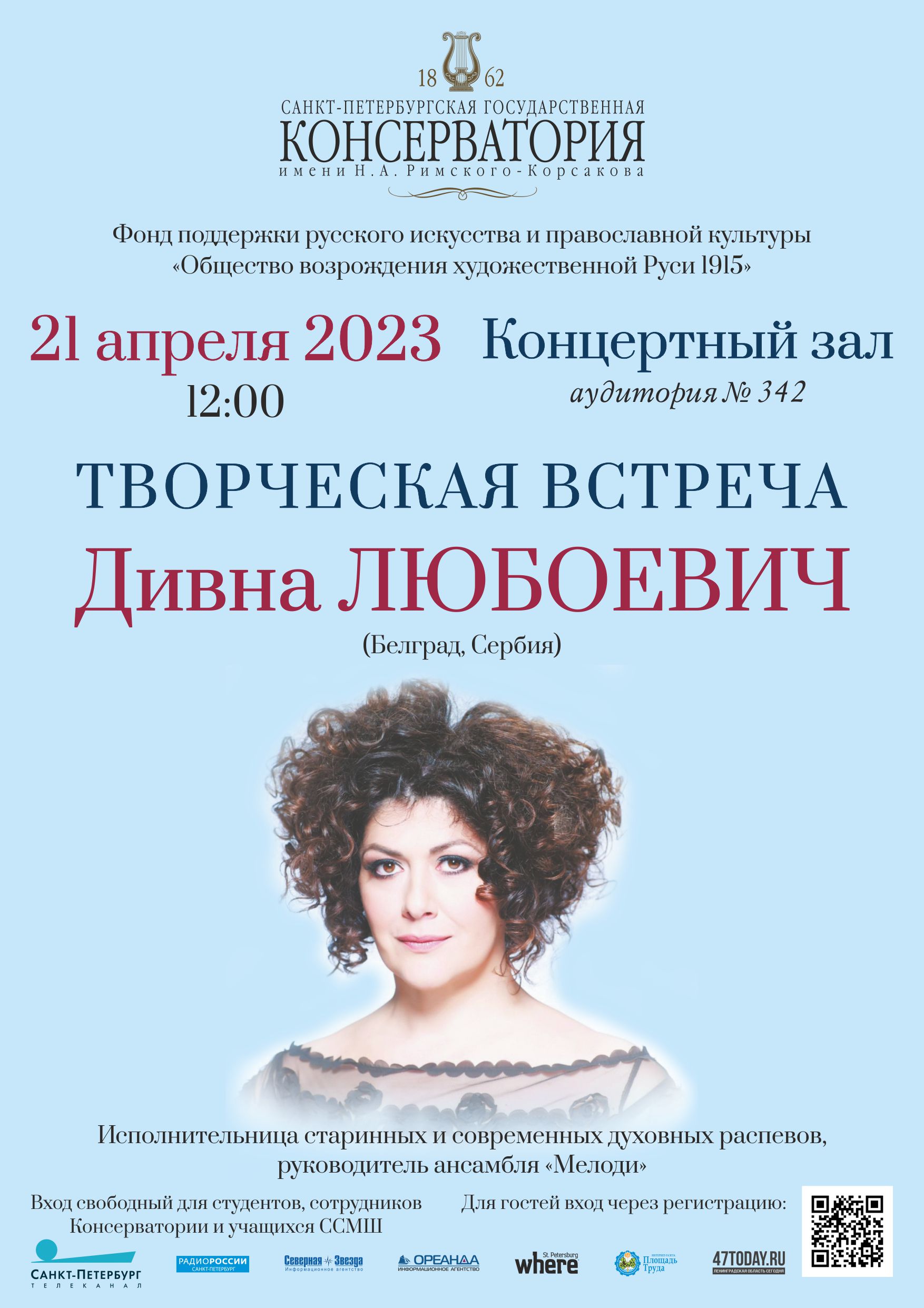 21 апреля 2023 в Санкт-Петербургской консерватории пройдёт творческая встреча с выдающейся исполнительницей духовной музыки, художественным руководителем ансамбля «Мелоди» Дивной Любоевич.