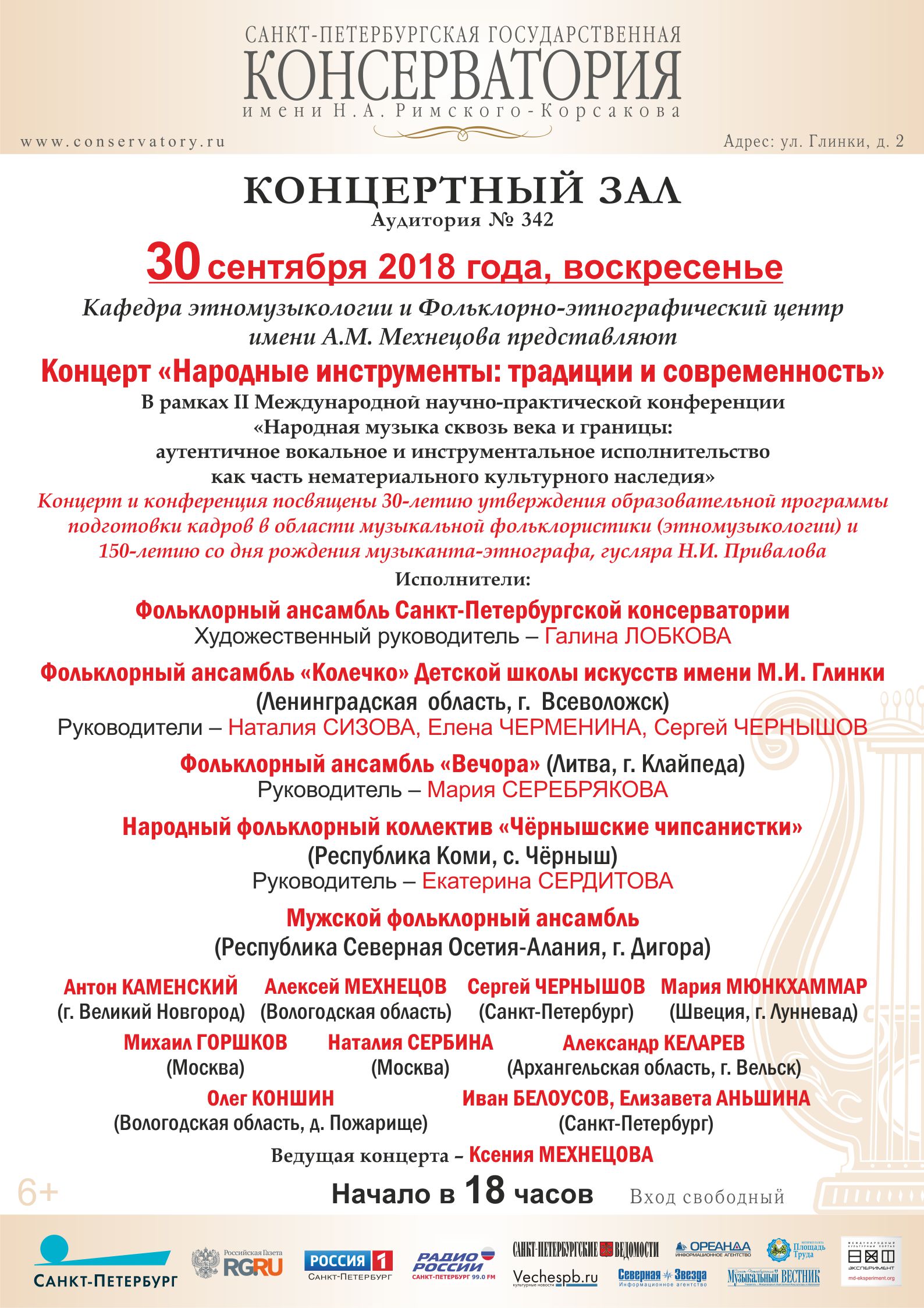 С 29 сентября по 03 октября 2018 года Кафедра этномузыкологии, Фольклорно-этнографический центр имени А. М. Мехнецова и Кабинет народного музыкального творчества Санкт-Петербургской государственной консерватории имени Н. А. Римского-Корсакова совместно с Ленинградским областным региональным отделением общероссийской общественной организации «Российский фольклорный союз» проводят II Международную научно-практическую конференцию «Народная музыка сквозь века и границы: аутентичное вокальное и инструментальное исполнительство как часть нематериального культурного наследия».