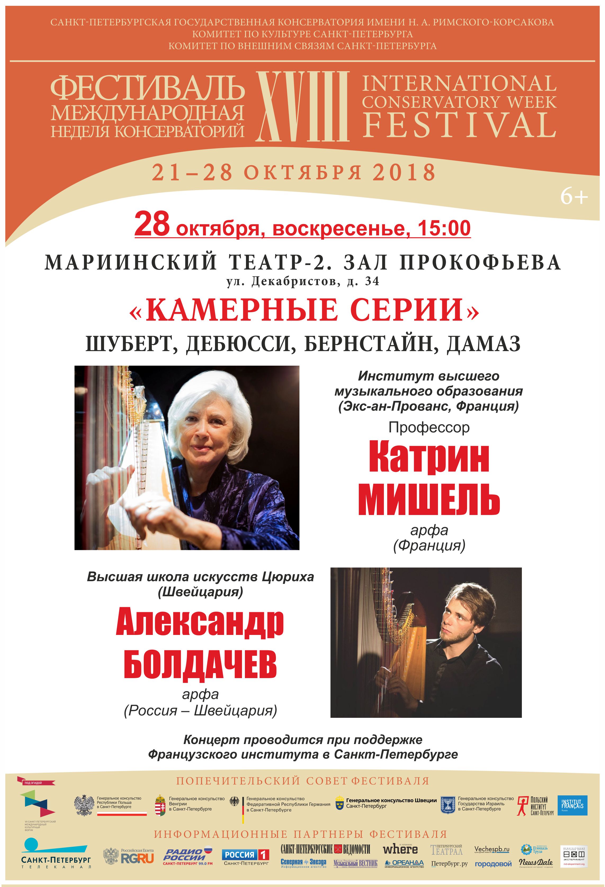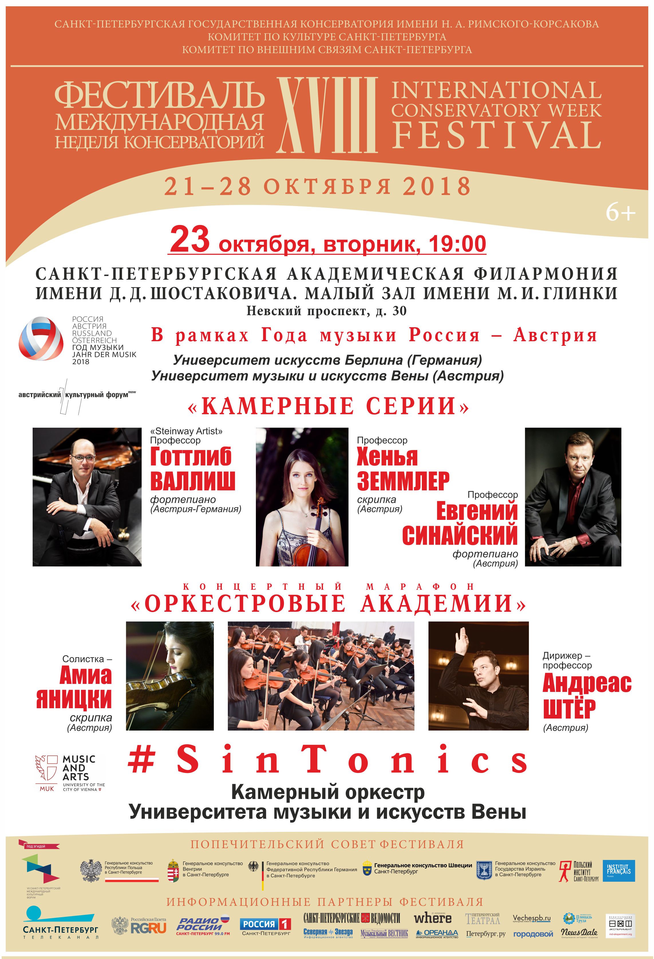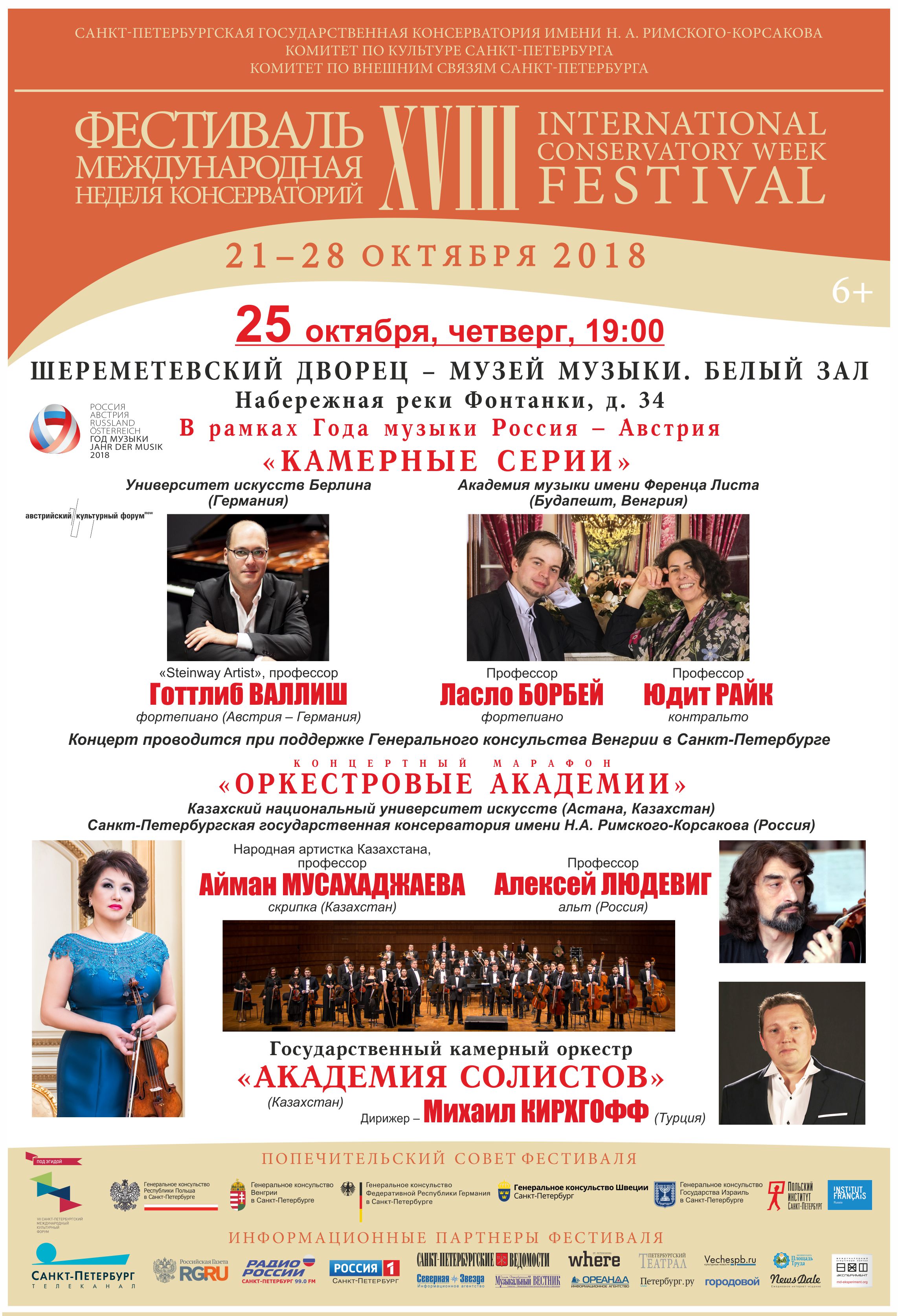 С 21 по 28 октября 2018 в Петербурге пройдет XVIII фестиваль «Международная неделя консерваторий», учрежденный Санкт-Петербургской государственной консерваторией имени Н.А. Римского-Корсакова в 2001 году. Проект, не имеющий аналогов в мировом музыкальном пространстве, за 17 лет представил более 270 высших школ музыки России, Европы, Северной и Южной Америки, Азии и Африки. Фестиваль проходит при поддержке Комитета по культуре и Комитета по внешним связям Санкт-Петербурга, под патронатом Попечительского совета, в состав которого вошли генеральные консульства и институты культуры стран-участниц. В программу глобального международного форума включены концертный и научно-образовательный разделы.