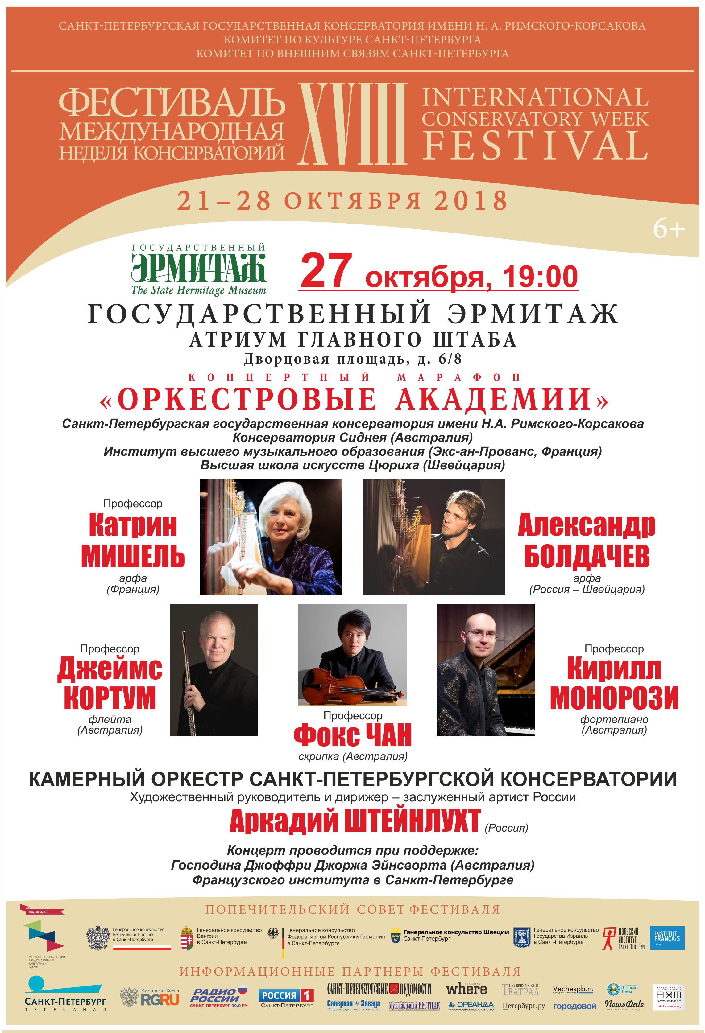 Фестиваль стартует 21 октября 2018 в Большом зале Санкт-Петербургской филармонии имени Д.Д. Шостаковича. В программе – сочинения Чайковского, Шостаковича и Свиридова. Исполнители – Хор и Симфонический оркестр Санкт-Петербургской консерватории под управлением народного артиста СССР Владимира Федосеева. На торжественной официальной церемонии маэстро будут вручены диплом и мантия Почетного профессора старейшей консерватории России. Масштабный проект «Оркестровые академии» представит пять симфонических и камерных оркестровых коллективов высших школ музыки России, Казахстана и Австрии. В разделе «Камерные серии» состоятся концерты с участием французских, немецких и русских музыкантов. В рамках «Органных академий» свое искусство продемонстрирует Карстен Вибуш. (Германия). Яркое событие концертной афиши – выступления выдающейся французской арфистки Катрин Мишель. Инновационная программа Ethno, Jazz, Rock XXI адресована молодежной аудитории. 24 октября на Новой сцене Александринского театра – исполнители этнической музыки из Польши и популярный гитарист Рафаэль Рогиньский, российские и израильские джазовые музыканты. Впервые в фестивальной программе ректор Санкт-Петербургской консерватории Алексей Васильев выступит в неакадемическом формате (вокал, бас-гитара), в составе творческого объединения «Меломаны»