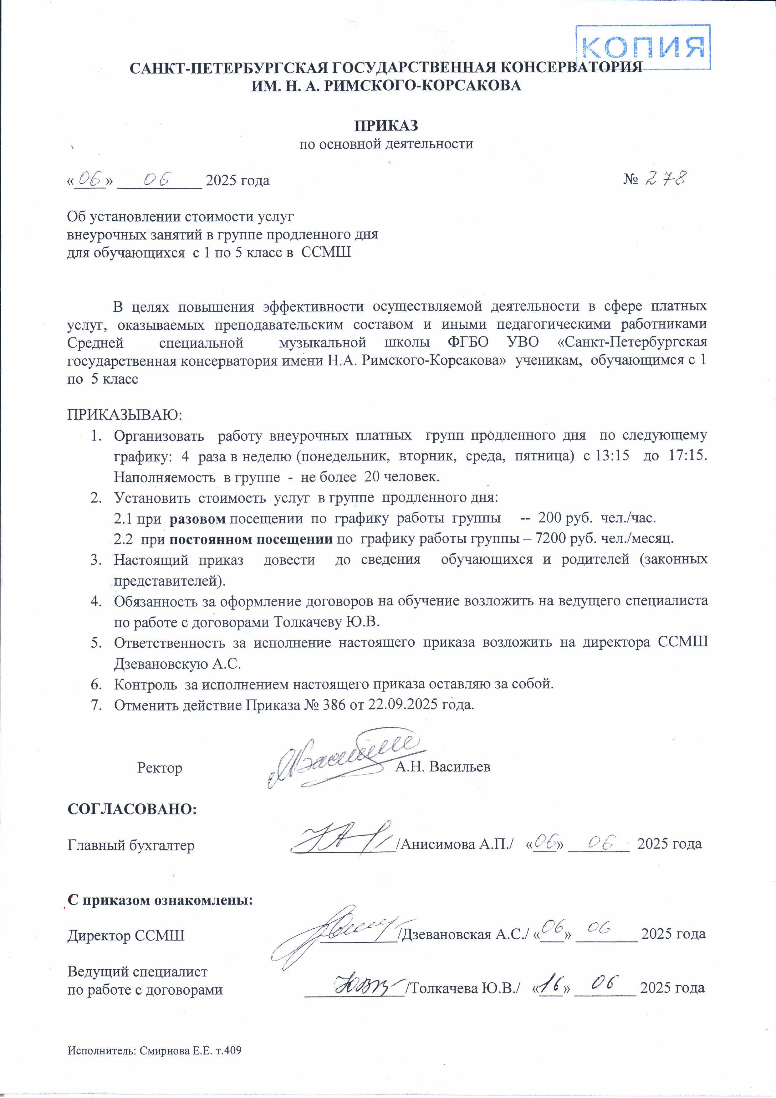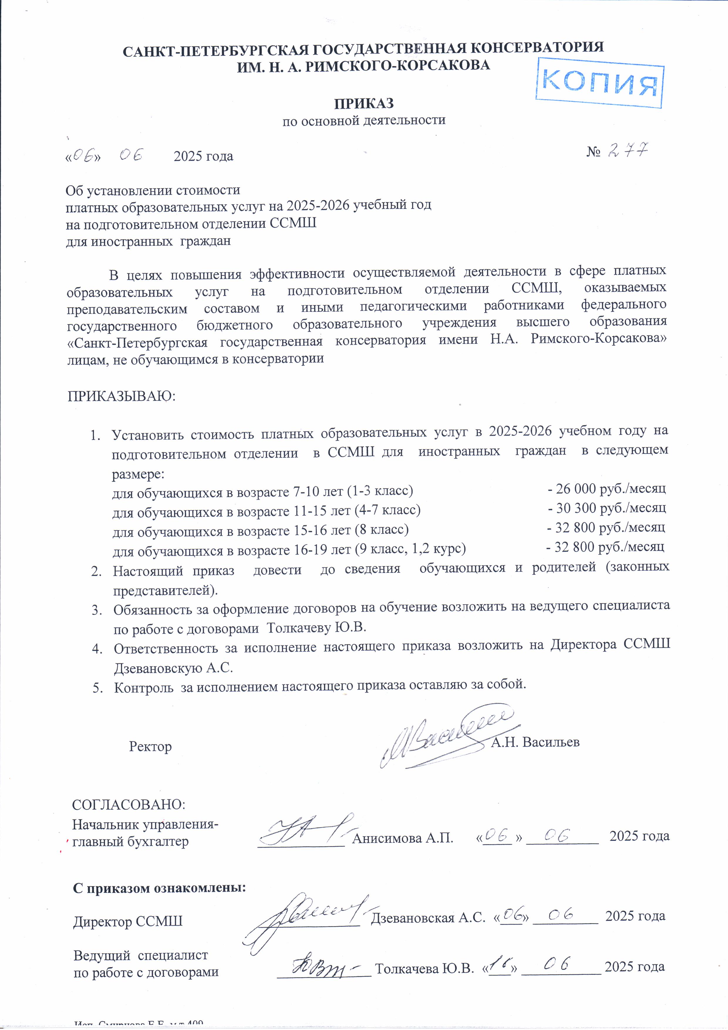 На основании приказа ректора Санкт-Петербургской государственной консерватории им. Н.А.Римского-Корсакова от 6 июня 2025 года № 279 "О стоимости платных образовательных услуг на 2025-2026 учебный год в ССМШ для граждан РФ и иностранных граждан"