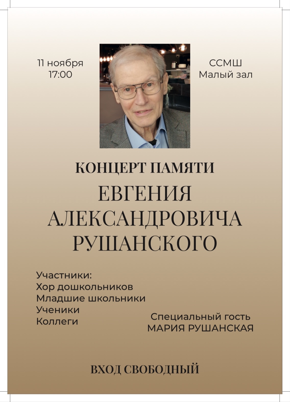 11 ноября 2025 года в 17 часов в Малом зале ССМШ состоится концерт памяти петербургского композитора, преподавателя ССМШ Евгения Александровича РУШАНСКОГО.