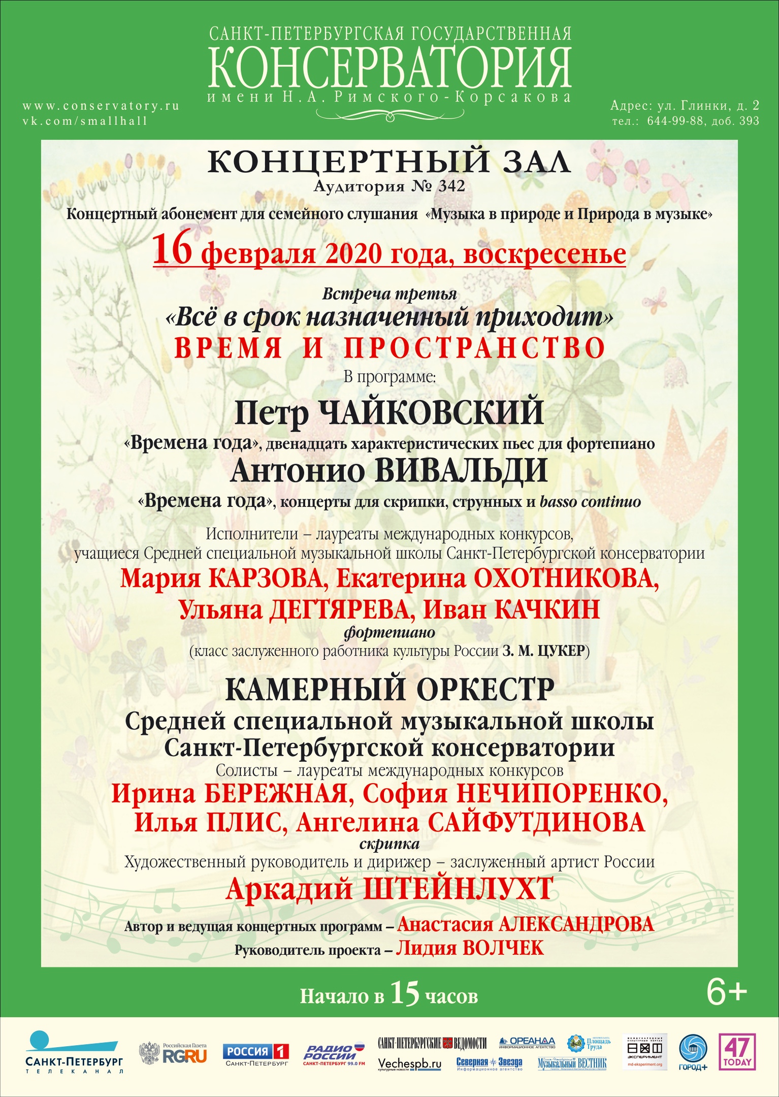 16 февраля 2020 года в 15 часов в концертном зале Санкт-Петербургской консерватории (аудитория № 342) состоится третья встреча концертного абонемента для семейного слушания "Музыка в природе и Природа в музыке" под названием "Все в срок назначенный приходит" - Время и пространство.