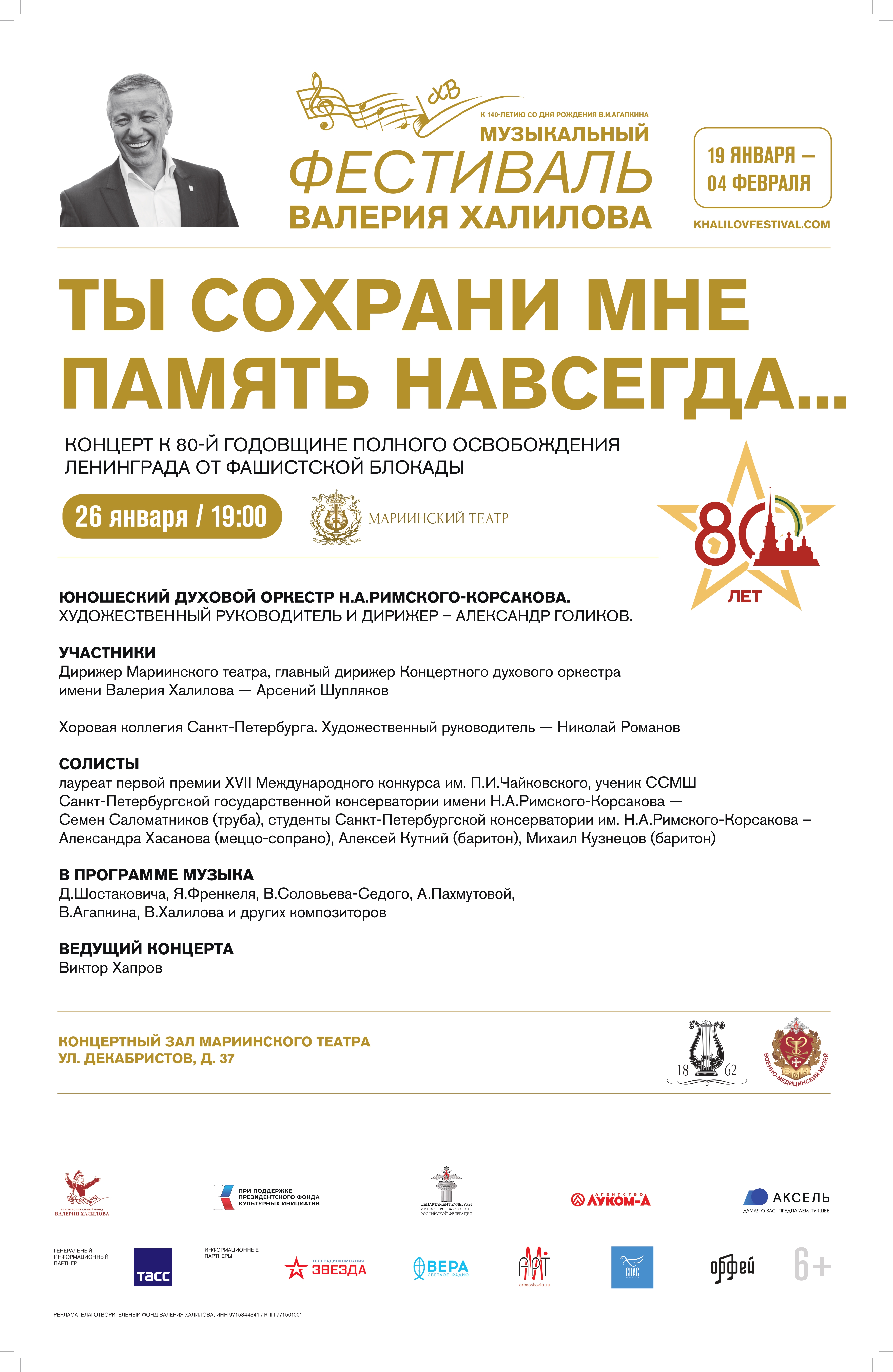 26 января 2024 года в 19 часов в Концертном зале Мариинского театра (ул. Декабристов, д. 37) состоится концерт Юношеского духового оркестра Н.А. Римского-Корсакова "Ты сохрани мне память навсегда..." (дирижер - Александр Голиков). Концерт посвящается 80-летию полного освобождения Ленинграда от фашисткой блокады.