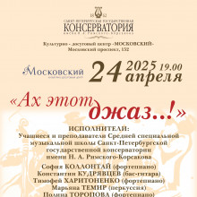 24 апреля 2025 года в 19 часов в Малом зале Культурно-досугового центра "Московский" состоится концерт учащихся Средней специальной музыкальной школы Санкт-Петербургской государственной консерватории им. Н.А. Римского-Корсакова, обучающихся джазовому направлению.